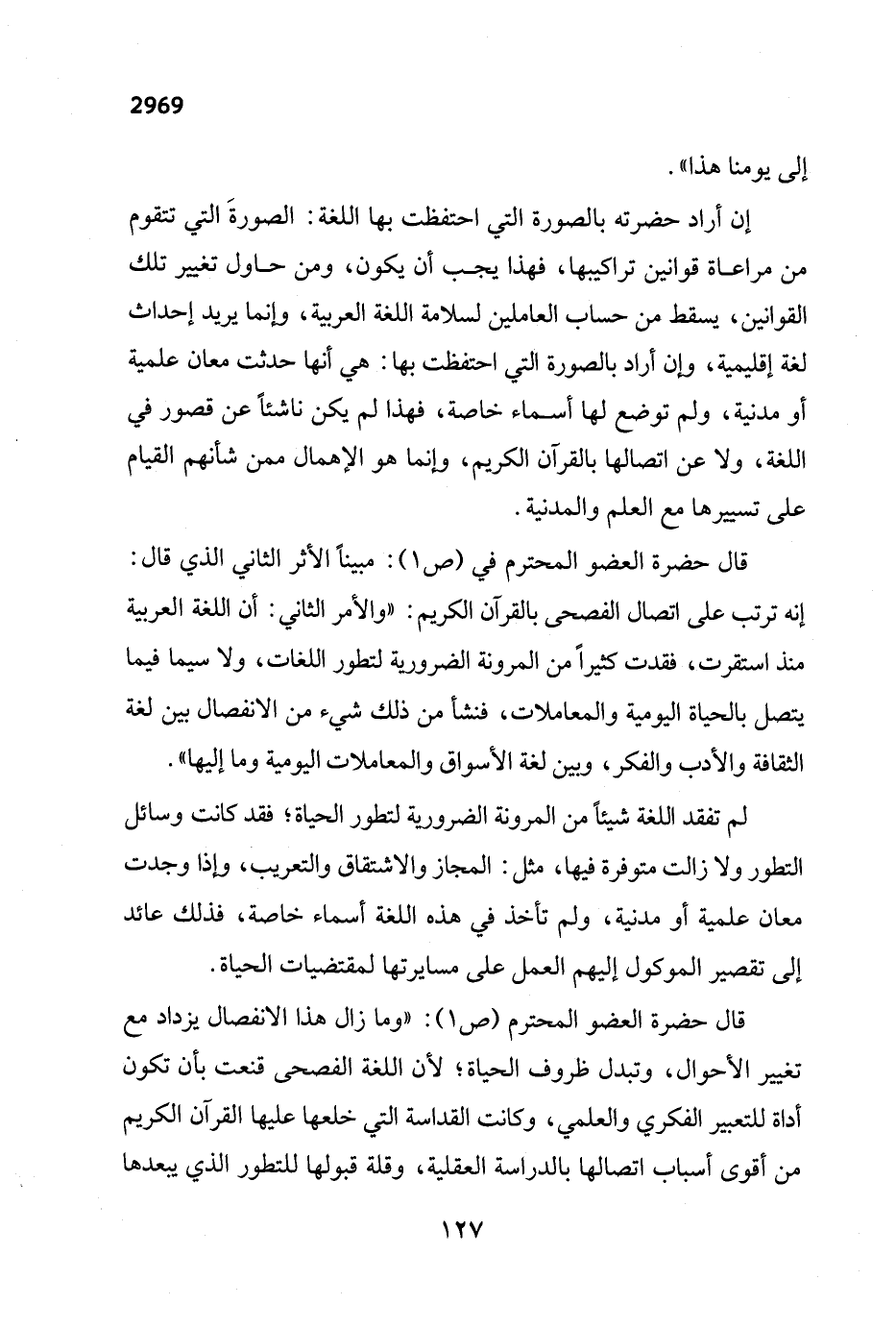 قال حضرة العضو المحترم (ص 1): "وما زال هذا الانفصال يزداد مع تغيير الأحوال، وتبدل ظروف الحياة؛ لأن اللغة الفصحى قنعت بأن تكون أداة للتعبير الفكري والعلمي، وكانت القداسة التي خلعها عليها القرآن الكريم من أقوى أسباب اتصالها بالدراسة العقلية، وقلة قبولها للتطور الذي يبعدها