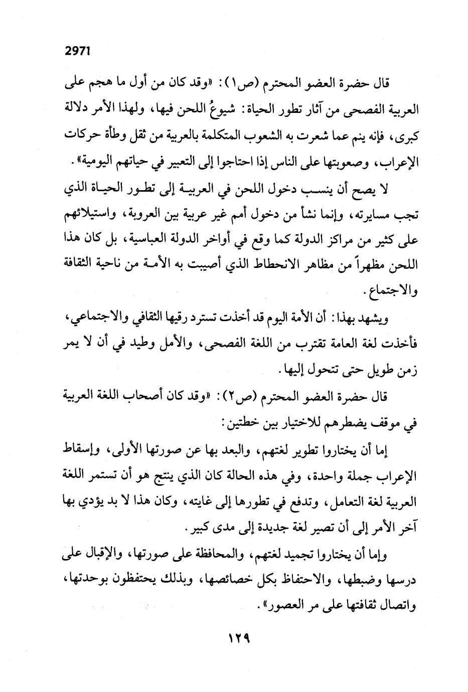 قال حضرة العضو المحترم (ص 1): "وقد كان من أول ما هجم على العربية الفصحى من آثار تطور الحياة: شيوعُ اللحن فيها، ولهذا الأمر دلالة كبرى، فإنه ينم عما شعرت به الشعوب المتكلمة بالعربية من ثقل وطأة حركات الإعراب، وصعوبتها على الناس إذا احتاجوا إلى التعبير في حياتهم اليومية".