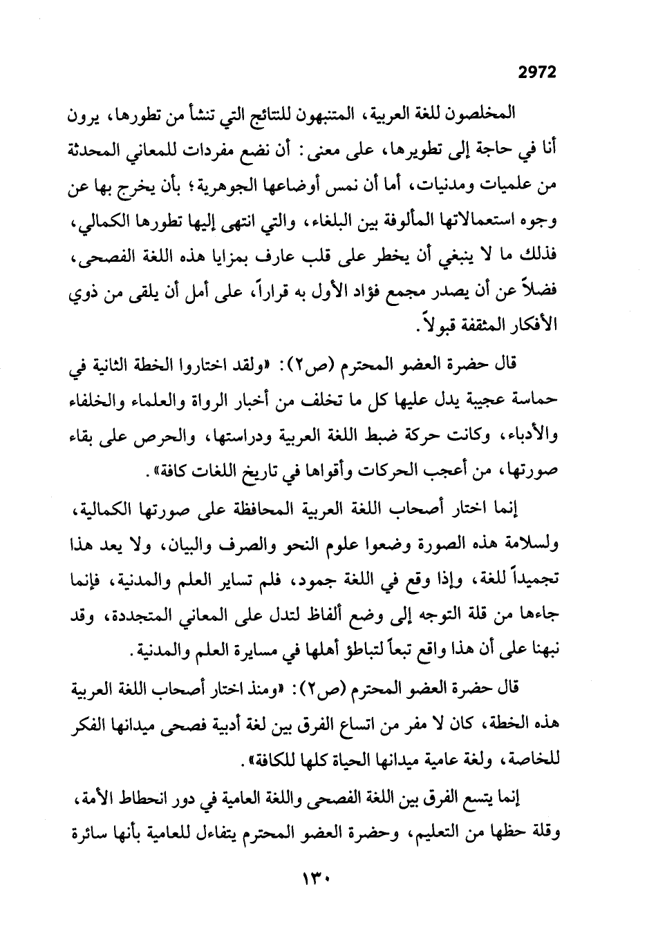 المخلصون للغة العربية، المتنبهون للنتائج التي تنشأ من تطورها، يرون أنا في حاجة إلى تطويرها، على معنى: أن نضع مفردات للمعاني المحدثة من علميات ومدنيات، أما أن نمس أوضاعها الجوهرية؛ بأن يخرج بها عن وجوه استعمالاتها المألوفة بين البلغاء، والتي انتهى إليها تطورها الكمالي، فذلك ما لا ينبغي أن يخطر على قلب عارف بمزايا هذه اللغة الفصحى، فضلاً عن أن يصدر مجمع فؤاد الأول به قراراً، على أمل أن يلقى من ذوي الأفكار المثقفة قبولاً.