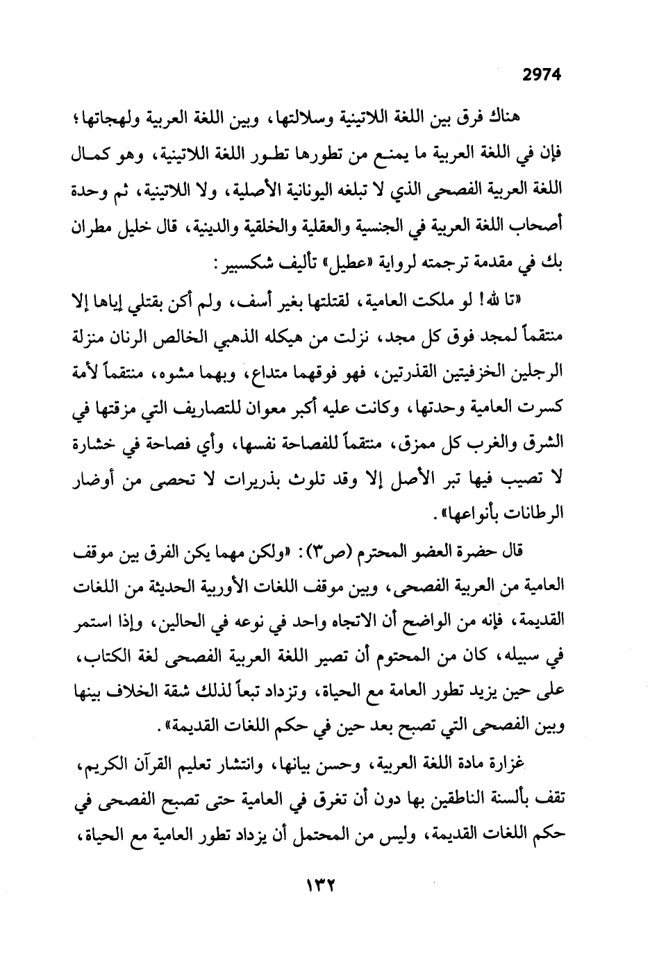 قال حضرة العضو المحترم (ص 3): "ولكن مهما يكن الفرق بين موقف العامية من العربية الفصحى، وبين موقف اللغات الأوريية الحديثة من اللغات القديمة، فإنه من الواضح أن الاتجاه واحد في نوعه في الحالين، وإذا استمر في سبيله، كان من المحتوم أن تصير اللغة العربية الفصحى لغة الكتاب، على حين يزيد تطور العامة مع الحياة، وتزداد تبعاً لذلك شقة الخلاف بينها وبين الفصحى التي تصبح بعد حين في حكم اللغات القديمة".