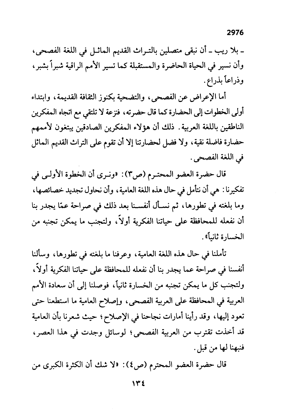 قال حضرة العضو المحترم (ص 3): "ونرى أن الخطوة الأولى في تفكيرنا: هي أن نتامل في حال هذه اللغة العامية، وأن نحاول تجديد خصائصها، وما بلغته في تطورها، ثم نسأل أنفسنا بعد ذلك في صراحة عمّا يجدر بنا أن نفعله للمحافظة على حياتنا الفكرية أولاً، ولتجنب ما يمكن تجنبه من الخسارة ثانياً".