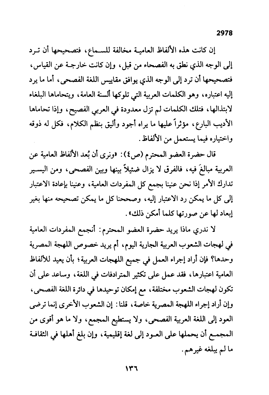 لا ندري ماذا يريد حضرة العضو المحترم: أنجمع المفردات العامية في لهجات الشعوب العربية الجارية اليوم، أم يريد خصوص اللهجة المصرية وحدها؟ فإن أراد إجراء العمل في جميع اللهجات العربية؛ بأن يعيد للألفاظ العامية اعتبارها، فقد عمل على تكثير المترادفات في اللغة، وساعد على أن تكون لهجات الشعوب مختلفة، مع إمكان توحيدها في دائرة اللغة الفصحى، وإن أراد إجراء اللهجة المصرية خاصة، قلنا: إن الشعوب الأخرى إنما ترضى العود إلى اللغة العربية الفصحى، ولا يستطيع المجمع، ولا ما هو أقوى من المجمع أن يحملها على العود إلى لغة إقليمية، وإن بلغ أهلها في الثقافة ما لم يبلغه غيرهم.