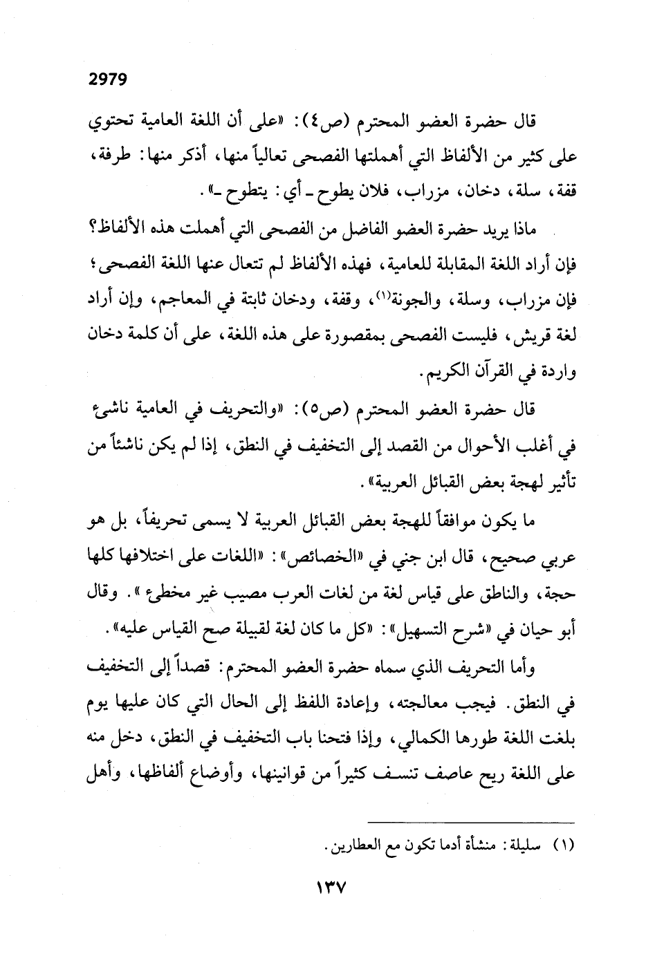 قال حضرة العضو المحترم (ص 5): "والتحريف في العامية ناشئ في أغلب الأحوال من القصد إلى التخفيف في النطق، إذا لم يكن ناشئاً من تأثير لهجة بعض القبائل العربية".