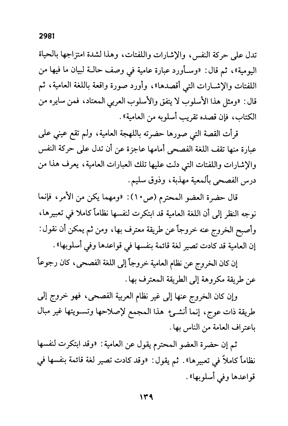 قال حضرة العضو المحترم (ص 10): "ومهما يكن من الأمر، فإنما نوجه النظر إلى أن اللغة العامية قد ابتكرت لنفسها نظاماً كاملا في تعبيرها، وأصبح الخروج عنه خروجاً عن طريقة معترف بها، ومن ثم يمكن أن نقول: إن العامية قد كادت تصير لغة قائمة بنفسها في قواعدها وفي أسلوبها".