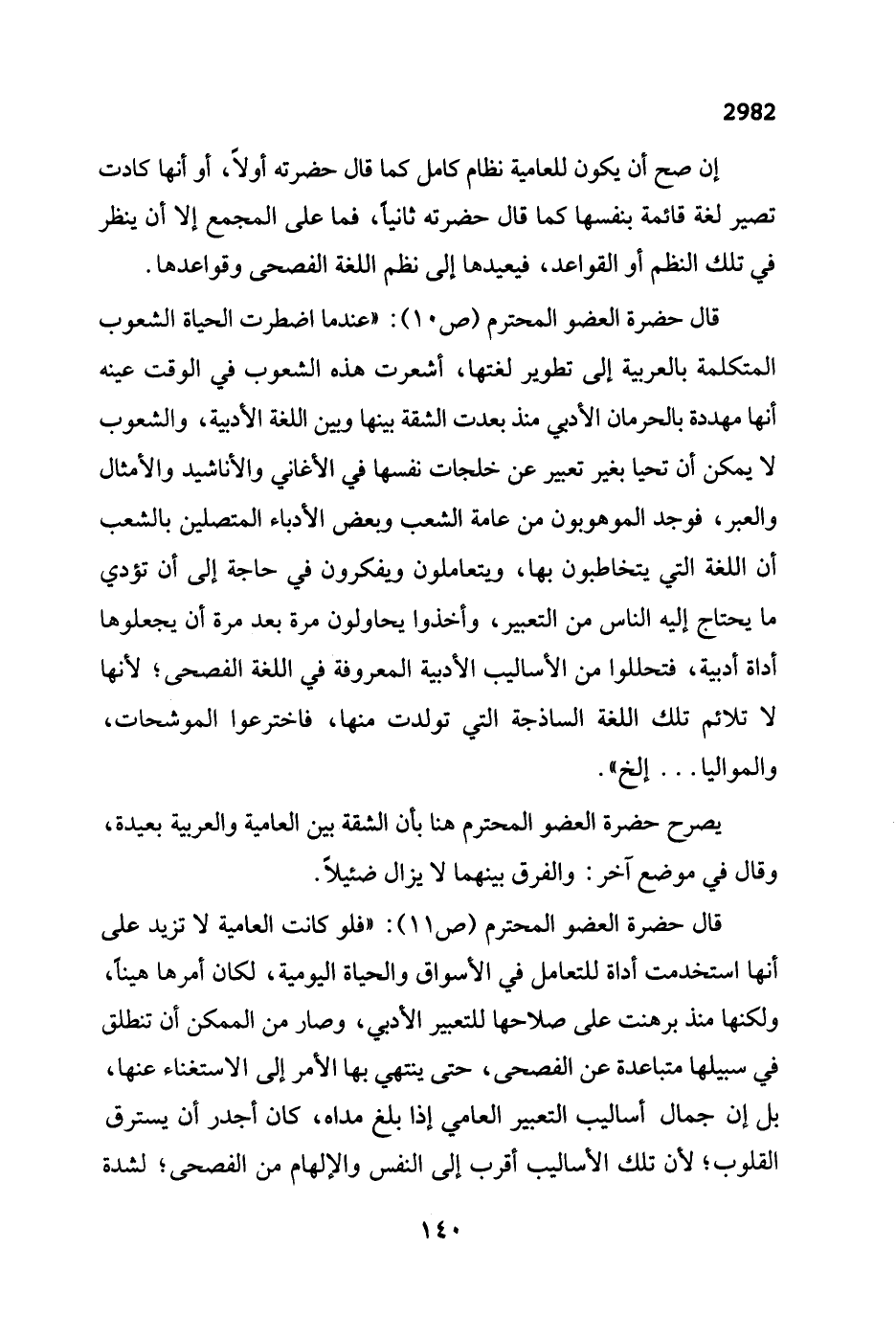 قال حضرة العضو المحترم (ص 10): "عندما اضطرت الحياة الشعوب المتكلمة بالعربية إلى تطوير لغتها، أشعرت هذه الشعوب في الوقت عينه أنها مهددة بالحرمان الأدبي منذ بعدت الشقة بينها وبين اللغة الأدبية، والشعوب لا يمكن أن تحيا بغير تعبير عن خلجات نفسها في الأغاني والأناشيد والأمثال والعبر، فوجد الموهوبون من عامة الشعب وبعض الأدباء المتصلين بالشعب أن اللغة التي يتخاطبون بها، ويتعاملون ويفكرون في حاجة إلى أن تؤدي ما يحتاج إليه الناس من التعبير، وأخذوا يحاولون مرة بعد مرة أن يجعلوها أداة أدبية، فتحللوا من الأساليب الأدبية المعروفة في اللغة الفصحى؛ لأنها لا تلائم تلك اللغة الساذجة التي تولدت منها، فاخترعوا الموشحات، والمواليا ... إلخ ".