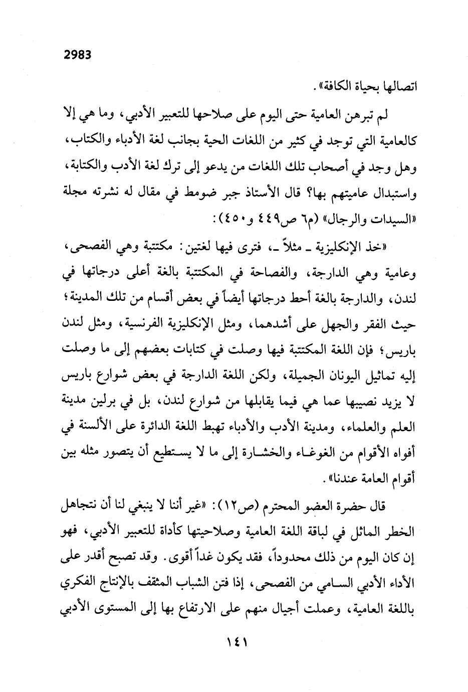 "خذ الإنكليزية - مثلاً -، فترى فيها لغتين: مكتتبة وهي الفصحى، وعامية وهي الدارجة، والفصاحة في المكتتبة بالغة أعلى درجاتها في لندن، والدارجة بالغة أحط درجاتها أيضاً في بعض أقسام من تلك المدينة؛ حيث الفقر والجهل على أشدهما، ومثل الإنكليزية الفرنسية، ومثل لندن باريس، فإن اللغة المكتتبة فيها وصلت في كتابات بعضهم إلى ما وصلت إليه تماثيل اليونان الجميلة، ولكن اللغة الدارجة في بعض شوارع باريس لا يزيد نصيبها عما هي فيما يقابلها من شوارع لندن، بل في برلين مدينة العلم والعلماء، ومدينة الأدب والأدباء تهبط اللغة الدائرة على الألسنة في أفواه الأقوام من الغوغاء والخشارة إلى ما لا يستطيع أن يتصور مثله بين أقوام العامة عندنا".
