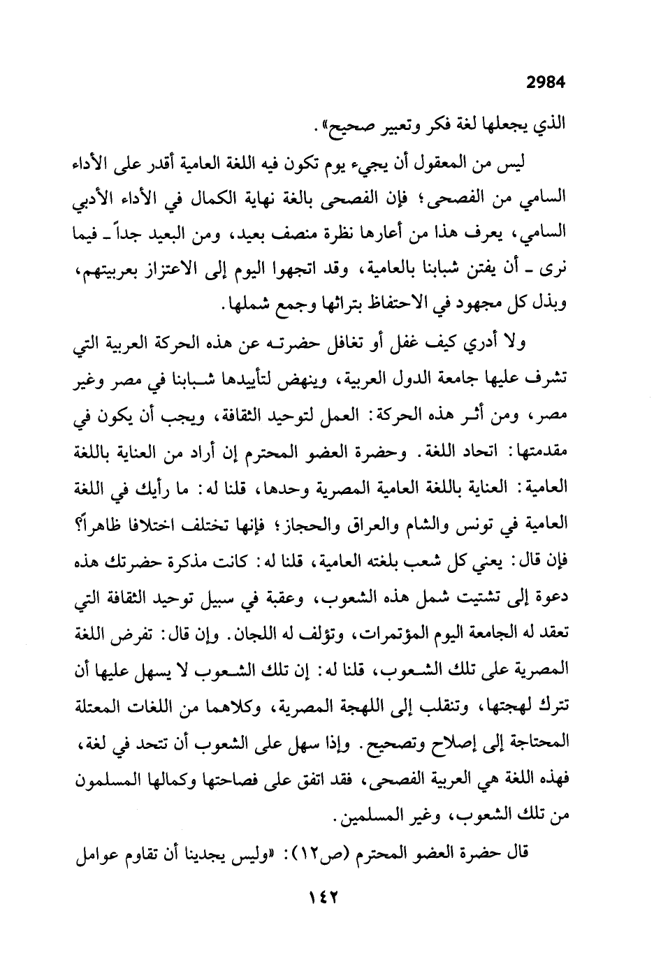 ولا أدري كيف غفل أو تغافل حضرته عن هذه الحركة العربية التي تشرف عليها جامعة الدول العربية، وينهض لتأييدها شبابنا في مصر وغير مصر، ومن أثر هذه الحركة: العمل لتوحيد الثقافة، ويجب أن يكون في مقدمتها: اتحاد اللغة. وحضرة العضو المحترم إن أراد من العناية باللغة العامية: العناية باللغة العامية المصرية وحدها، قلنا له: ما رأيك في اللغة العامية في تونس والشام والعراق والحجاز؛ فإنها تختلف اختلافا ظاهراً؟ فإن قال: يعني كل شعب بلغته العامية، قلنا له: كانت مذكرة حضرتك هذه دعوة إلى تشتيت شمل هذه الشعوب، وعقبة في سبيل توحيد الثقافة التي تعقد له الجامعة اليوم المؤتمرات، وتؤلف له اللجان. وإن قال: تفرض اللغة المصرية على تلك الشعوب، قلنا له: إن تلك الشعوب لا يسهل عليها أن تترك لهجتها، وتنقلب إلى اللهجة المصرية، وكلاهما من اللغات المعتلة المحتاجة إلى إصلاح وتصحيح. وإذا سهل على الشعوب أن تتحد في لغة، فهذه اللغة هي العربية الفصحى، فقد اتفق على فصاحتها وكمالها المسلمون من تلك الشعوب، وغير المسلمين.