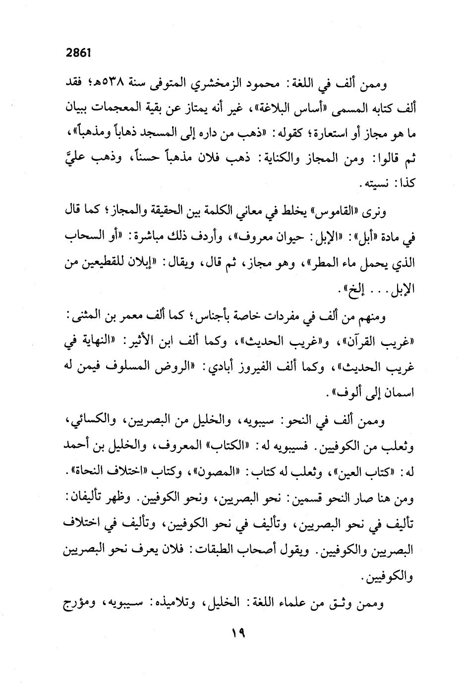 وممن ألف في اللغة: محمود الزمخشري المتوفى سنة 538 هـ؛ فقد ألف كتابه المسمى "أساس البلاغة"، غير أنه يمتاز عن بقية المعجمات ببيان ما هو مجاز أو استعارة؛ كقوله: "ذهب من داره إلى المسجد ذهابًا ومذهباً"، ثم قالوا: ومن المجاز والكناية: ذهب فلان مذهباً حسناً، وذهب عليَّ كذا: نسيته.