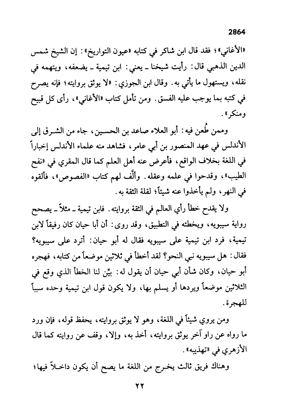 ولا يقدح خطأ رأي العالم في الثقة بروايته. فابن تيمية - مثلاً - يصحح رواية سيبويه، ويخطئه في التطبيق، وقد روى: أن أبا حيان كان رفيقًا لابن تيمية، فرد ابن تيمية على سيبويه فقال له أبو حيان: أترد على سيبويه؟ فقال: هل سيبويه نبي النحو؟ لقد أخطأ في ثلاثين موضعاً من كتابه، فهجره أبو حيان، وكان شأن أبي حيان أن يقول له: بيِّن لنا الخطأ الذي وقع في الثلاثين موضعاً ويردها أو يسلم بها، ولا يكون قول ابن تيمية وحده سبباً للهجرة.