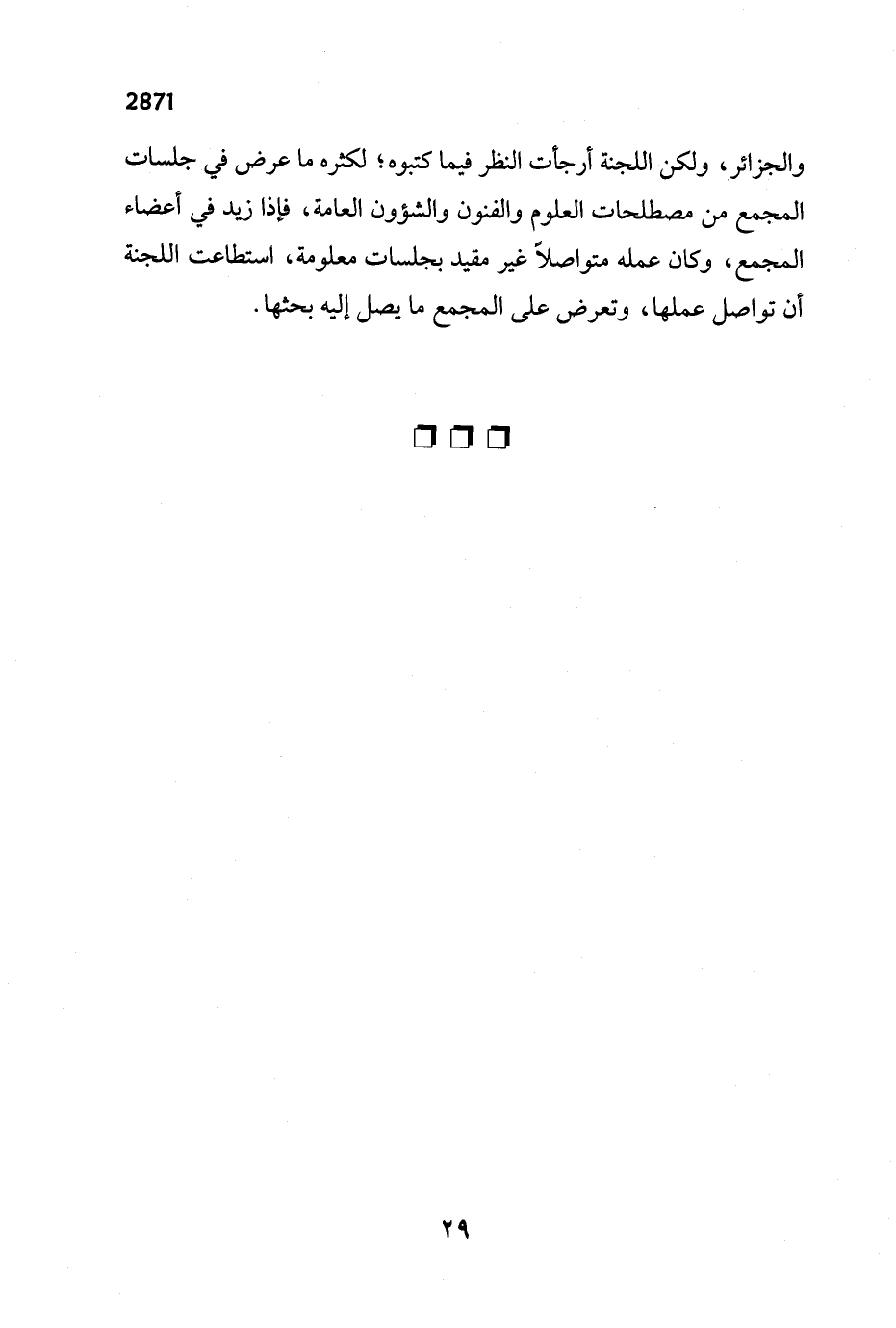 والجزائر، ولكن اللجنة أرجات النظر فيما كتبوه؛ لكثره ما عرض في جلسات المجمع من مصطلحات العلوم والفنون والشؤون العامة، فإذا زيد في أعضاء المجمع، وكان عمله متواصلاً غير مقيد بجلسات معلومة، استطاعت اللجنة أن تواصل عملها، وتعرض على المجمع ما يصل إليه بحثها.