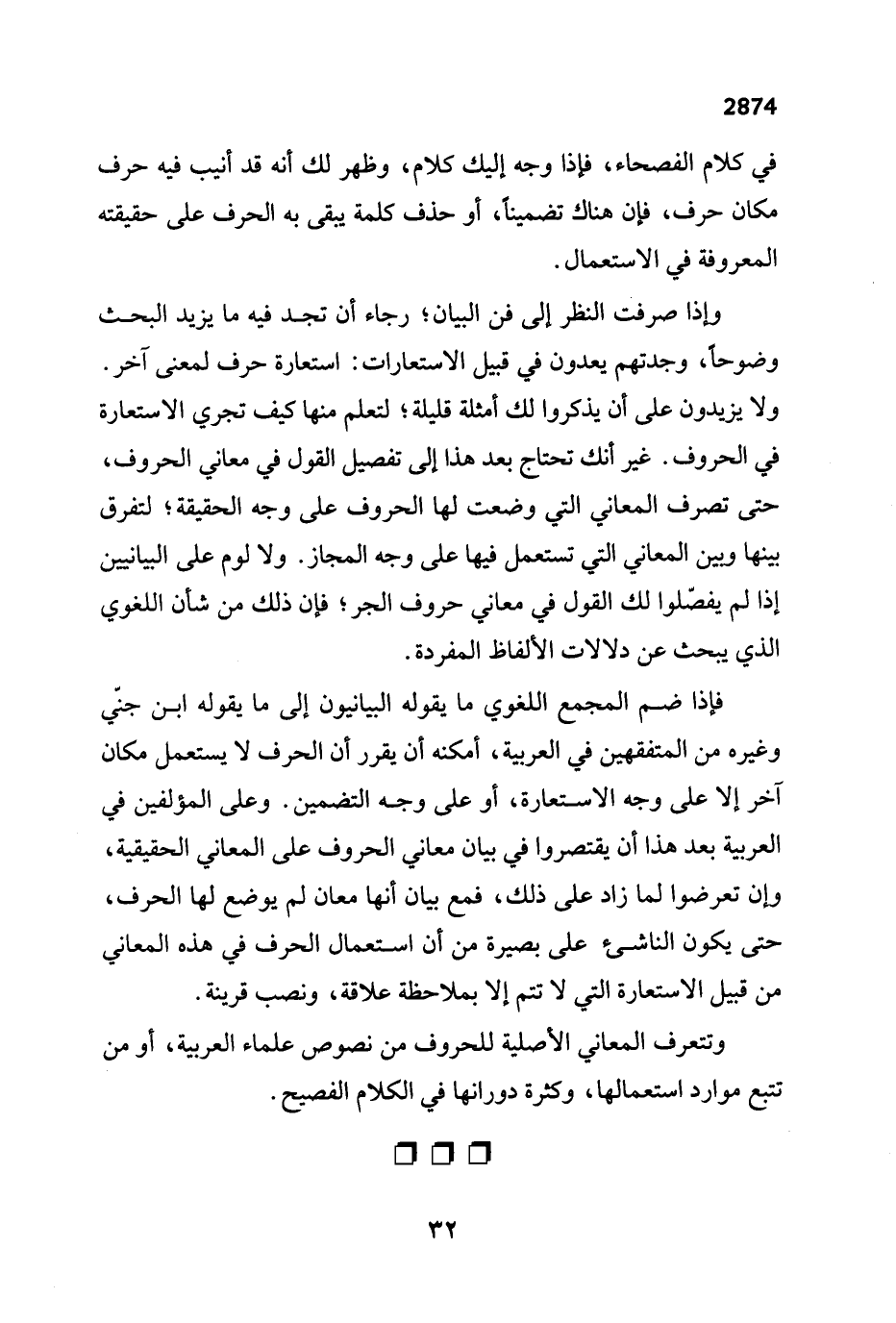 فإذا ضم المجمع اللغوي ما يقوله البيانيون إلى ما يقوله ابن جنّي وغيره من المتفقهين في العربية، أمكنه أن يقرر أن الحرف لا يستعمل مكان آخر إلا على وجه الاستعارة، أو على وجه التضمين. وعلى المؤلفين في العربية بعد هذا أن يقتصروا في بيان معاني الحروف على المعاني الحقيقية، وإن تعرضوا لما زاد على ذلك، فمع بيان أنها معان لم يوضع لها الحرف، حتى يكون الناشئ على بصيرة من أن استعمال الحرف في هذه المعاني من قبيل الاستعارة التي لا تتم إلا بملاحظة علاقة، ونصب قرينة.