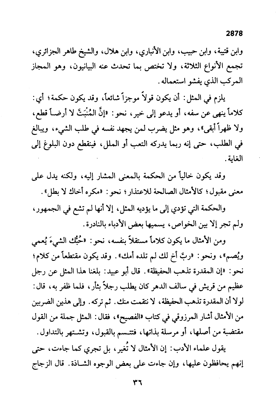 وابن قتيبة، وابن حبيب، وابن الأنباري، وابن هلال، والشيخ طاهر الجزائري، تجمع الأنواع الثلاثة، ولا تختص بما تحدث عنه البيانيون، وهو المجاز المركب الذي يفشو استعماله. يلزم في المثل: أن يكون قولاً موجزاً شائعاً، وقد يكون حكمة؛ أي: كلاماً ينهى عن سفه، أو يدعو إلى خير، نحو: "إنَ المُنْبَتَّ لا أرضًا قطع، ولا ظهرًا أبقي"، وهو مثل يضرب لمن يجهد نفسه في طلب الشيء، ويبالغ في الطلب، حتى إنه ربما يدركه التعب أو الملل، فينقطع دون البلوغ إلى الغاية.