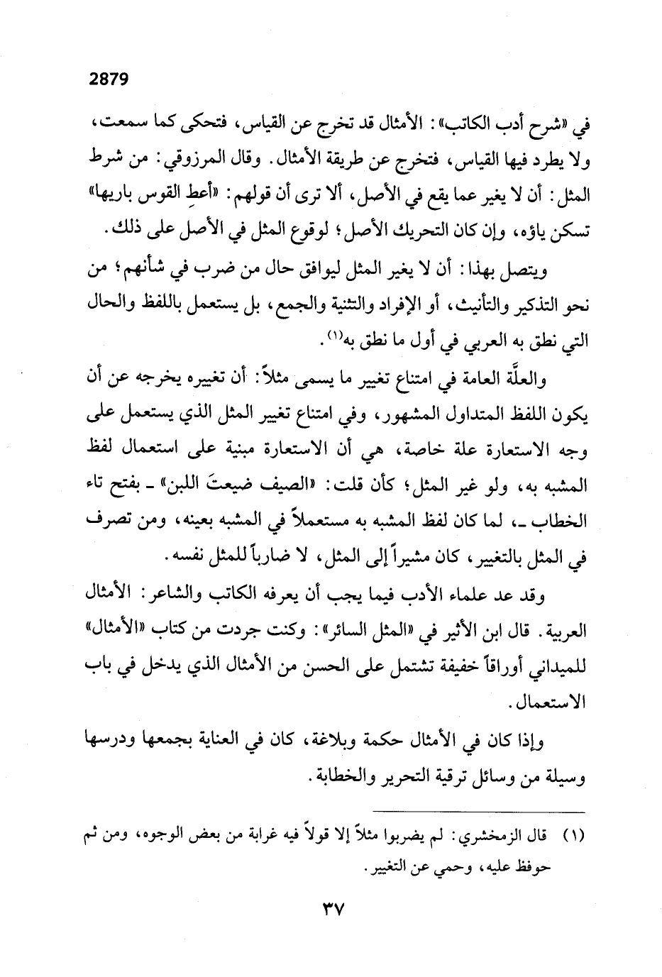 ويتصل بهذا: أن لا يغير المثل ليوافق حال من ضرب في شأنهم؛ من نحو التذكير والتأنيث، أو الإفراد والتثنية والجمع، بل يستعمل باللفظ والحال التي نطق به العربي في أول ما نطق به (¬1).