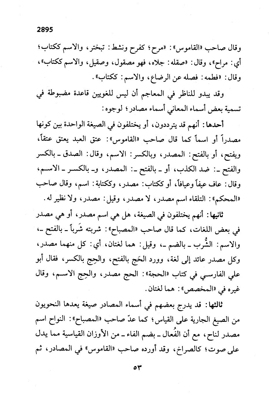 ثانيها: أنهم يختلفون في الصيغة، هل هي اسم مصدر، أو هي مصدر في بعض اللغات، كما قال صاحب "المصباح": شربته شَرباً - بالفتح -، والاسم: الشُّرب - بالضم -، وقيل: همالغتان، أي: كل منهما مصدر، وكل مصدر عائد إلى لغة، وورد الحَج بالفتح، والحِج بالكسر، فقال أبو علي الفارسي في كتاب "الحجة": الحج مصدر، والحِج الاسم، وقال غيره في "المخصص": همالغتان.