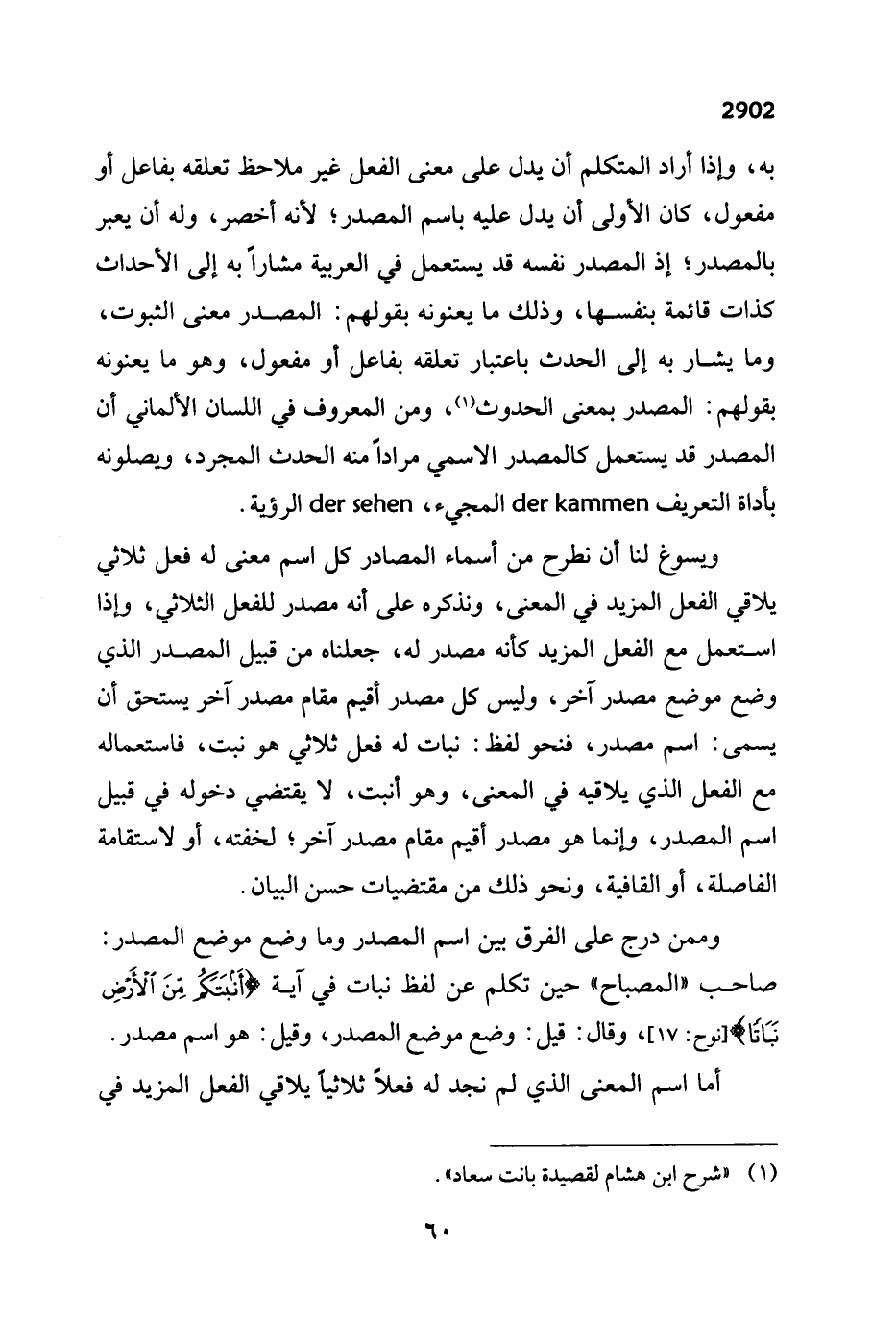 به، وإذا أراد المتكلم أن يدل على معنى الفعل غير ملاحظ تعلقه بفاعل أو مفعول، كان الأولى أن يدل عليه باسم المصدر؛ لأنه أخصر، وله أن يعبر بالمصدر؛ إذ المصدر نفسه قد يستعمل في العربية مشاراً به إلى الاحداث كذات قائمة بنفسها، وذلك ما يعنونه بقولهم: المصدر معنى الثبوت، وما يشار به إلى الحدث باعتبار تعلقه بفاعل أو مفعول، وهو ما يعنونه بقولهم: المصدر بمعنى الحدوث (¬1)، ومن المعروف في اللسان الألماني أن المصدر قد يستعمل كالمصدر الاسمي مراداً منه الحدث المجرد ويصلونه بأداة التعريف der kammen المجيء، der sehen الرؤية.