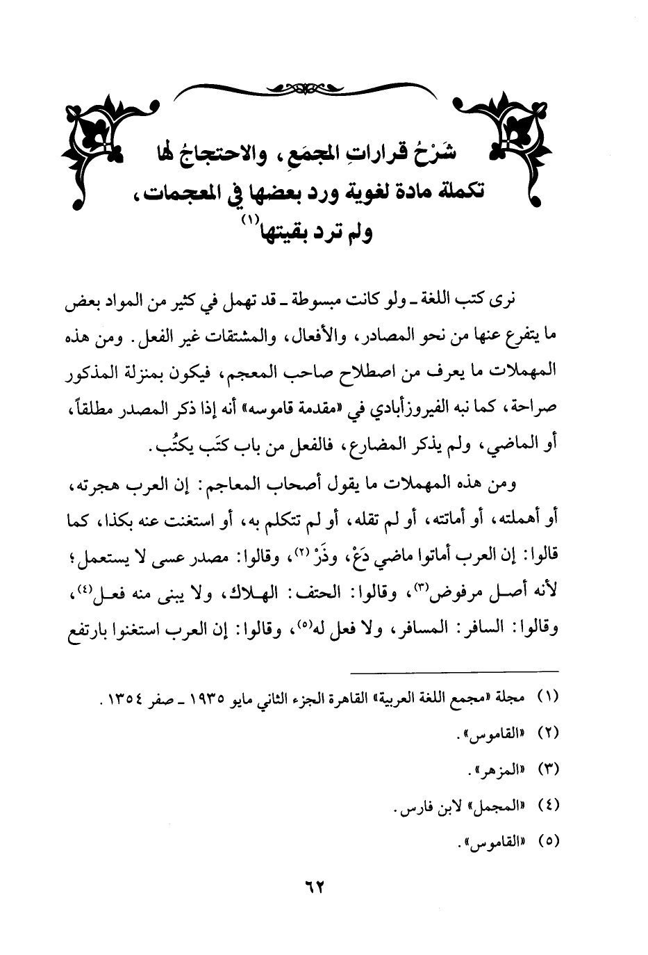 شَرْحُ قراراتِ المجمَعِ، والاحتجاجُ لها تكملة مادة لغوية ورد بعضها في المعجمات، ولم ترد بقيتها (¬1)