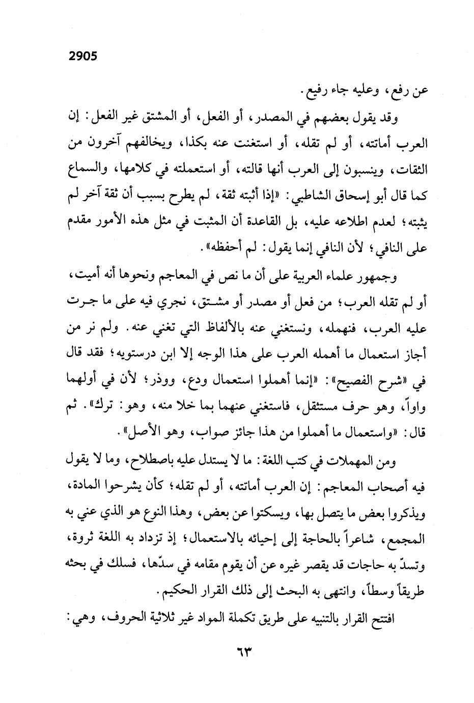 وجمهور علماء العربية على أن ما نص في المعاجم ونحوها أنه أميت، أو لم تقله العرب؛ من فعل أو مصدر أو مشتق، نجري فيه على ما جرت عليه العرب، فنهمله، ونستغني عنه بالألفاظ التي تغني عنه. ولم نر من أجاز استعمال ما أهمله العرب على هذا الوجه إلا ابن درستويه؛ فقد قال في "شرح الفصيح": "إنما أهملوا استعمال ودع، ووذر؛ لأن في أولهما واواً، وهو حرف مستثقل، فاستغني عنهما بما خلا منه، وهو: ترك". ثم قال: "واستعمال ما أهملوا من هذا جائز صواب، وهو الأصل". ومن المهملات في كتب اللغة: مالا يستدل عليه باصطلاخ، ومالا يقول فيه أصحاب المعاجم: إن العرب أماتته، أو لم تقله؛ كأن يشرحوا المادة، ويذكروا بعض ما يتصل بها، ويسكتوا عن بعض، وهذا النوع هو الذي عني به المجمع، شاعراً بالحاجة إلى إحيائه بالاستعمال؛ إذ تزداد به اللغة ثروة، وتسدّ به حاجات قد يقصر غيره عن أن يقوم مقامه في سدّها، فسلك في بحثه طريقاً وسطاً، وانتهى به البحث إلى ذلك القرار الحكيم.