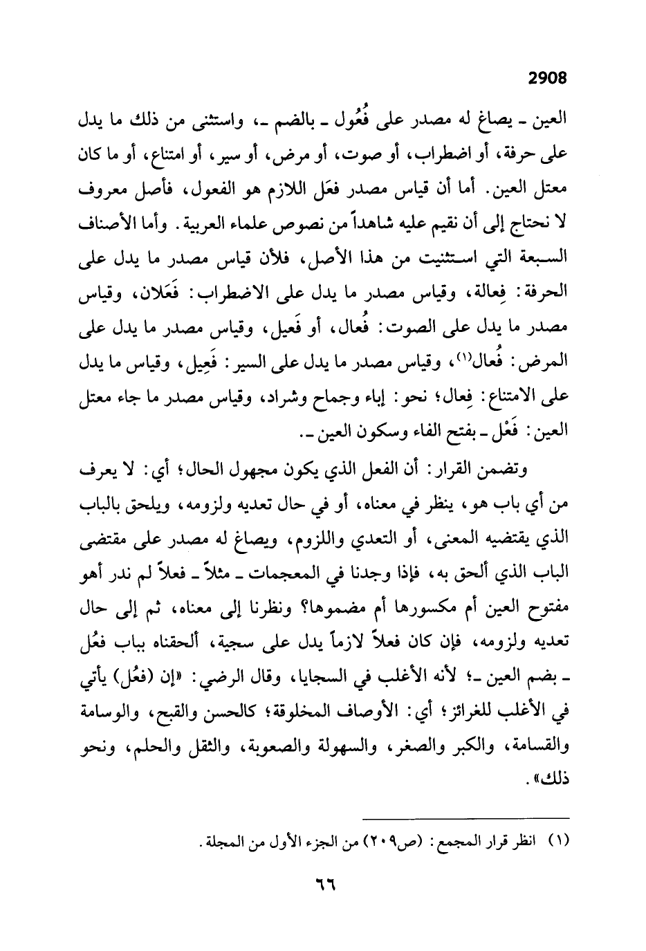 وتضمن القرار: أن الفعل الذي يكون مجهول الحال؛ أي: لا يعرف من أي باب هو، ينظر في معناه، أو في حال تعديه ولزومه، ويلحق بالباب الذي يقتضيه المعنى، أو التعدي واللزوم، ويصاغ له مصدر على مقتضى الباب الذي ألحق به، فإذا وجدنا في المعجمات - مثلاً - فعلاً لم ندر أهو مفتوح العين أم مكسورها أم مضموها؟ ونظرنا إلى معناه، ثم إلى حال تعديه ولزومه، فإن كان فعلاً لازماً يدل على سجية، ألحقناه بباب فعُل - بضم العين -؛ لأنه الأغلب في السجايا، وقال الرضي: "إن (فعُل) يأتي في الأغلب للغرائز؛ أي: الأوصاف المخلوقة؛ كالحسن والقبح، والوسامة والقسامة، والكبر والصغر، والسهولة والصعوبة، والثقل والحلم، ونحو ذلك".