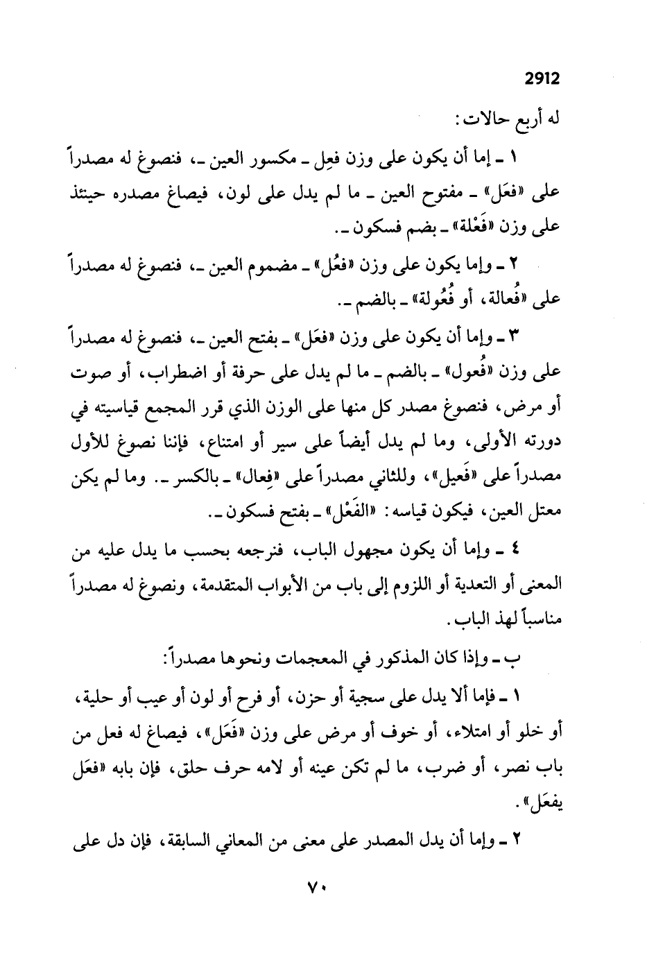 3 - وإما أن يكون على وزن " فعَل" - بفتح العين-، فنصوغ له مصدراً على وزن "فعول " - بالضم - مالم يدل على حرفة أو اضطراب، أو صوت أو مرض، فنصوغ مصدر كل منها على الوزن الذي قرر المجمع قياسيته في دورته الأولى، ومالم يدل أيضاً على سير أو امتناع، فإننا نصوغ للأول مصدراً على "فَعيل"، وللثاني مصدراً على "فِعال" - بالكسر -. ومالم يكن معتل العين، فيكون قياسه: "الفَعْل" - بفتح فسكون-.