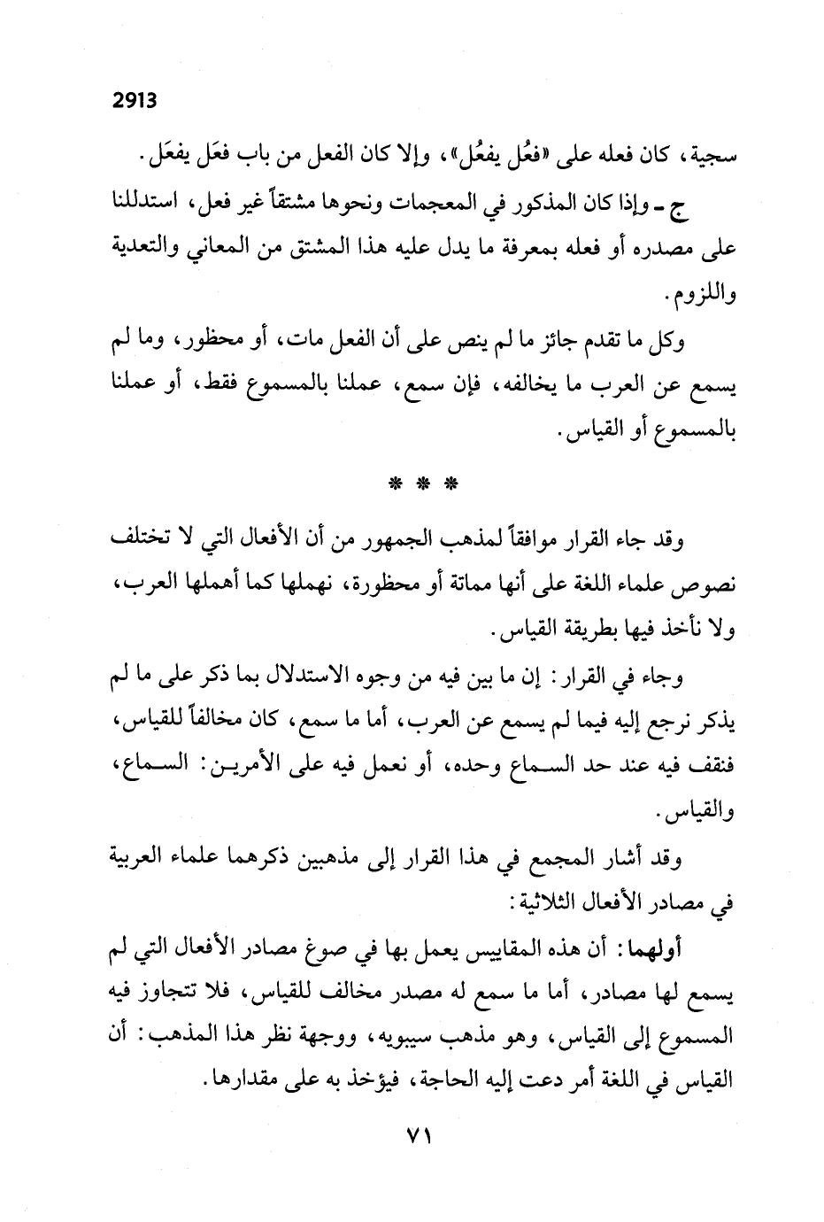 وجاء في القرار: إن ما بين فيه من وجوه الاستدلال بما ذكر على مالم يذكر نرجع إليه فيمالم يسمع عن العرب، أما ماسمع، كان مخالفاً للقياس، فنقف فيه عند حد السماع وحده، أو نعمل فيه على الأمرين: السماع، والقياس.