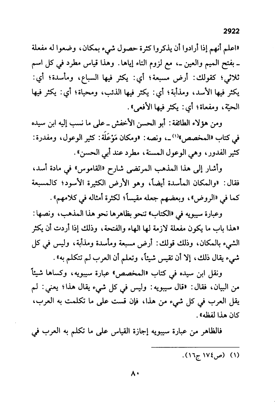 وعبارة سيبويه في "الكتاب" تنحو بظاهرها نحو هذا المذهب، ونصها: "هذا باب ما يكون مفعلة لازمة لها الهاء والفتحة، وذلك إذا أردت أن يكثر الشيء بالمكان، وذلك قولك: أرض مسبعة ومأسدة ومذأبة، وليس في كل شيء يقال ذلك، إلا أن تقيس شيئاً، وتعلم أن العرب لم تتكلم به".