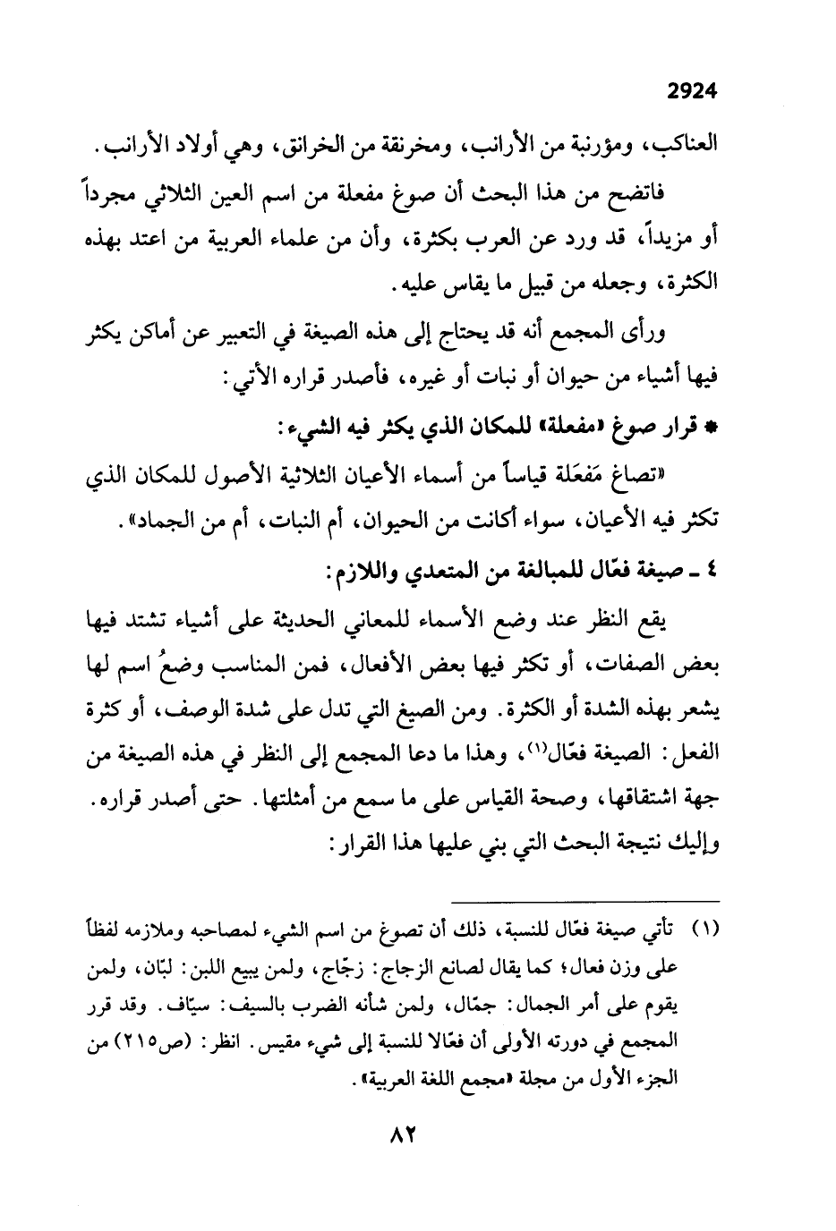 ورأى المجمع أنه قد يحتاج إلى هذه الصيغة في التعبير عن أماكن يكثر فيها أشياء من حيوان أو نبات أو غيره، فأصدر قراره الآتي: