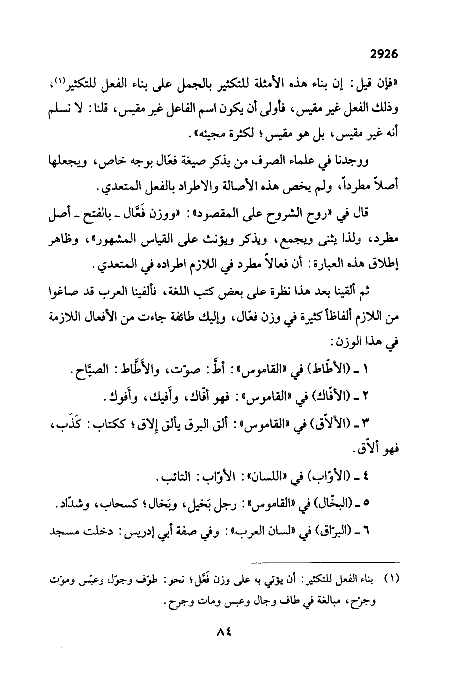 ووجدنا في علماء الصرف من يذكر صيغة فعّال بوجه خاص، ويجعلها أصلاً مطرداً، ولم يخص هذه الأصالة والاطراد بالفعل المتعدي.
