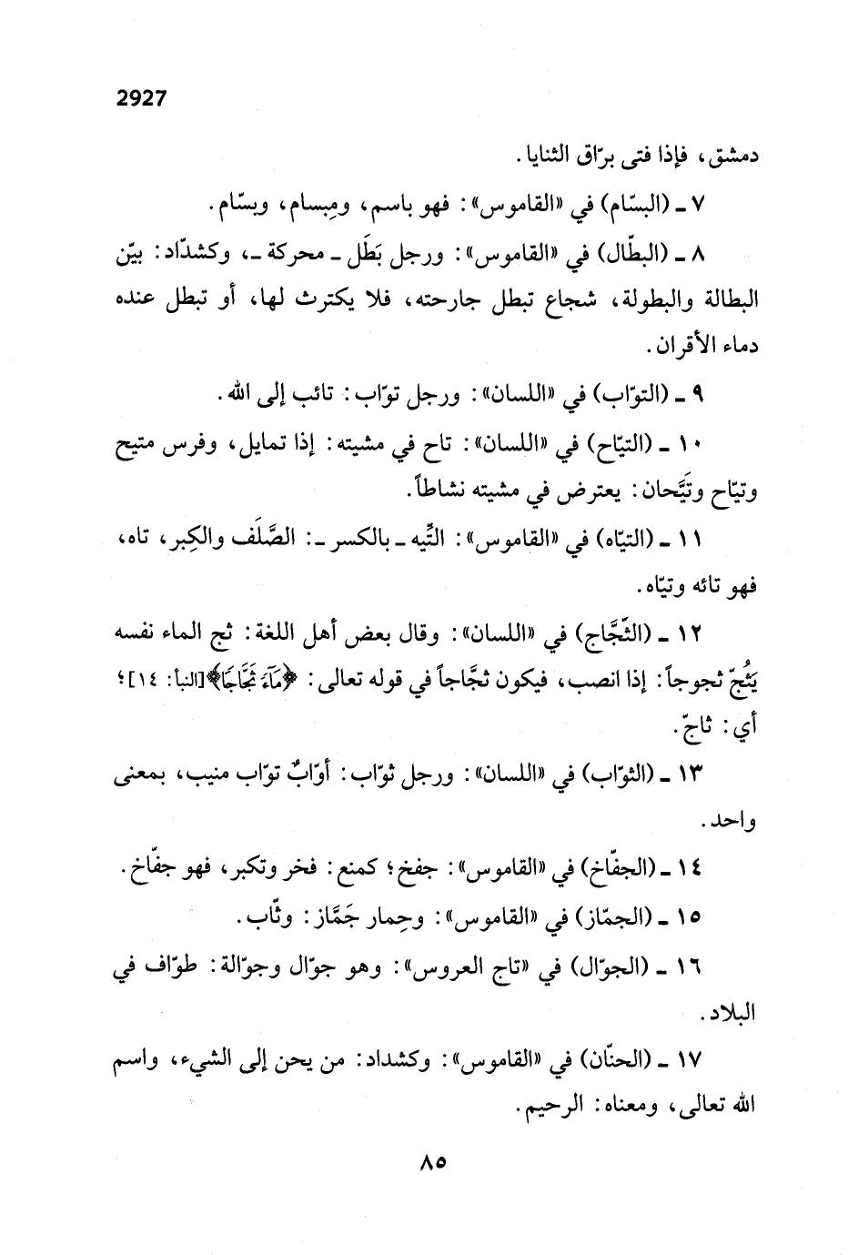 12 - (الثَجَّاج) في "اللسان": وقال بعض أهل اللغة: ثج الماء نفسه يَثُجّ ثجوجاً: إذا انصب، فيكون ثجَّاجاً في قوله تعالى: {مَاءً ثَجَّاجًا} [النبأ: 14]؛ أي: ثاجّ.