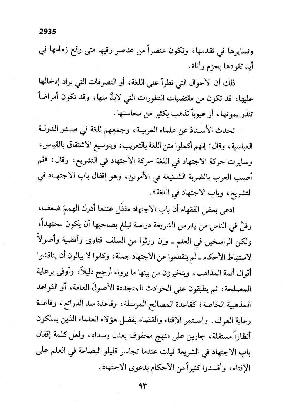 تحدث الأستاذ عن علماء العربية، وجمعِهم للغة في صدر الدولة العباسية، وقال: إنهم أكملوا متن اللغة بالتعريب، وبتوسيع الاشتقاق بالقياس، وسايرت حركة الاجتهاد في اللغة حركة الاجتهاد في التشريع، وقال: "ثم أصيب العرب بالضربة الشنيعة في الأمرين، وهو إقفال باب الاجتهاد في التشريع، وباب الاجتهاد في اللغة".