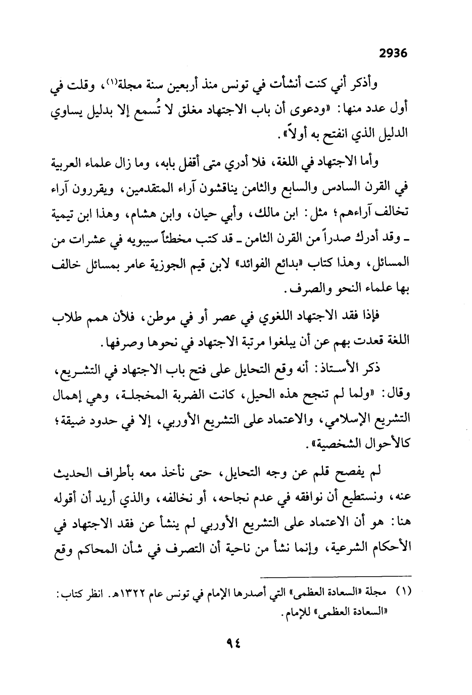 وأذكر أني كنت أنشات في تونس منذ أربعين سنة مجلة (¬1)، وقلت في أول عدد منها: "ودعوى أن باب الاجتهاد مغلق لا تُسمع إلا بدليل يساوي الدليل الذي انفتح به أولاً".
