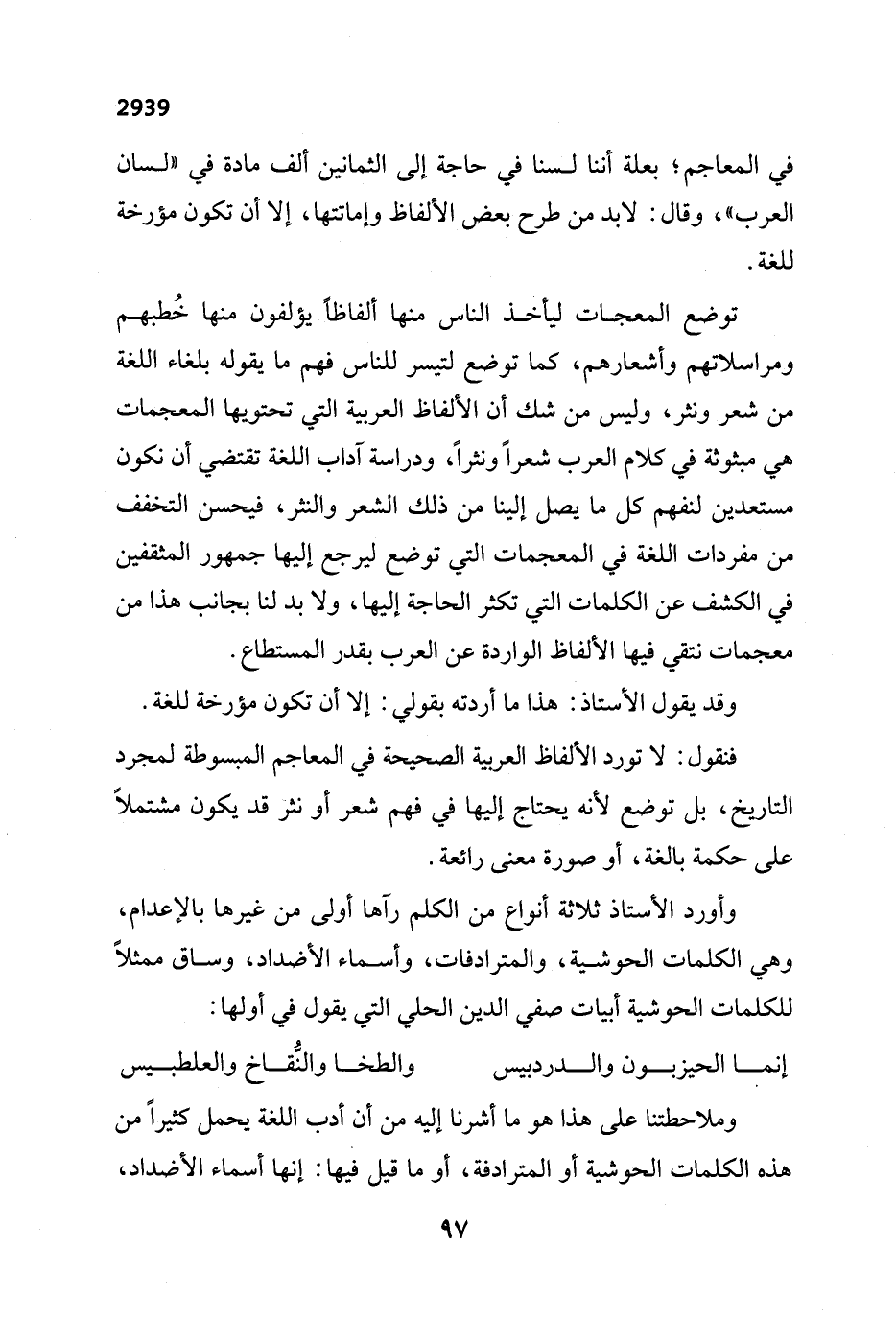 في المعاجم؛ بعلة أننا لسنا في حاجة إلى الثمانين ألف مادة في "لسان العرب"، وقال: لابد من طرح بعض الألفاظ وإماتتها، إلا أن تكون مؤرخة للغة.