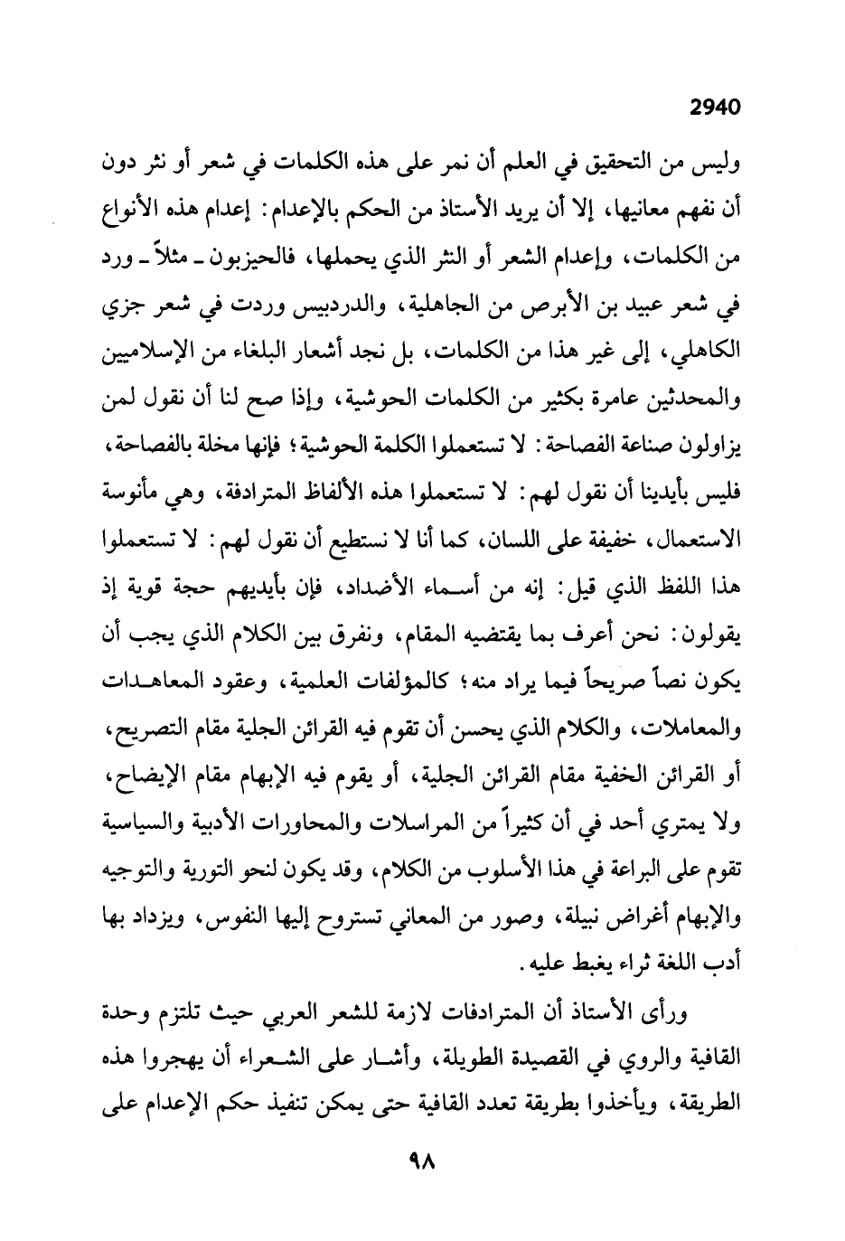 ورأى الأستاذ أن المترادفات لازمة للشعر العربي حيث تلتزم وحدة القافية والروي في القصيدة الطويلة، وأشار على الشعراء أن يهجروا هذه الطريقة، ويأخذوا بطريقة تعدد القافية حتى يمكن تنفيذ حكم الإعدام على