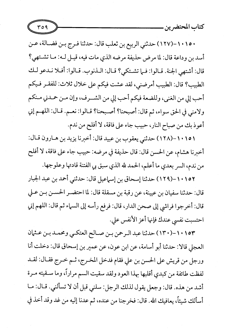127 - حَدَّثَنِي الرَّبِيعُ بْنُ ثَعْلَبٍ قَالَ: حَدَّثَنَا فَرَجُ بْنُ فَضَالَةَ، عَنْ أَسَدِ بْنِ وَدَاعَةَ قَالَ: لَمَّا مَرِضَ حُذَيْفَةُ مَرَضَهُ الَّذِي مَاتَ فِيهِ، قِيلَ لَهُ: مَا تَشْتَهِي؟ قَالَ: أَشْتَهِي الْجَنَّةَ, قَالُوا: فَمَا تَشْتَكِي؟ قَالَ: الذُّنُوبَ, قَالُوا: أَفَلاَ نَدْعُو لَكَ الطَّبِيبَ؟ قَالَ: الطَّبِيبُ أَمْرَضَنِي, لَقَدْ عِشْتُ فِيكُمْ عَلَى خِلاَلٍ ثَلاَثٍ: لَلْفَقْرُ فِيكُمْ أَحَبُّ إِلَيَّ مِنَ الْغِنَى، وَلَلضَّعَةُ فِيكُمْ أَحَبُّ إِلَيَّ مِنَ الشَّرَفِ، وَإِنَّ مَنْ حَمِدَنِي مِنْكُمْ وَلاَمَنِي فِي الْحَقِّ سَوَاءٌ, ثُمَّ قَالَ: أَصْبَحْنَا؟ أَصْبَحْنَا؟ قَالُوا: نَعَمْ, قَالَ: اللَّهُمَّ إِنِّي أَعُوذُ بِكَ مِنْ صَبَاحِ النَّارِ, حَبِيبٌ جَاءَ عَلَى فَاقَةٍ, لاَ أَفْلَحَ مَنْ نَدِمَ.