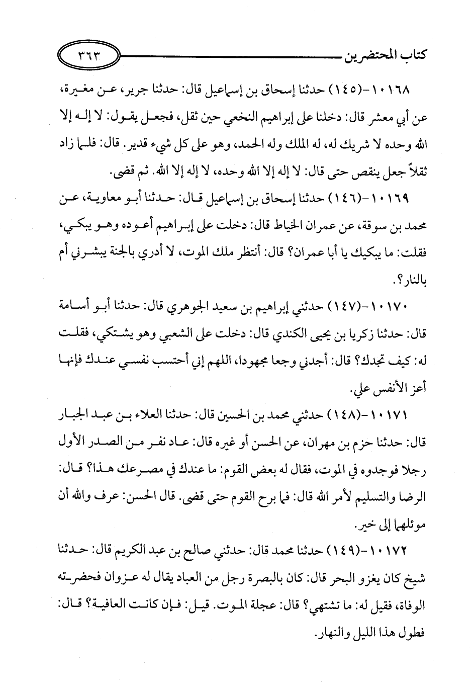 145 - حَدَّثَنَا إِسْحَاقُ بْنُ إِسْمَاعِيلَ قَالَ: حَدَّثَنَا جَرِيرٌ، عَنْ مُغِيرَةَ، عَنْ أَبِي مَعْشَرٍ قَالَ: دَخَلْنَا عَلَى إِبْرَاهِيمَ النَّخَعِيِّ حِينَ ثَقُلَ، فَجَعَلَ يَقُولُ: لاَ إِلَهَ إِلاَّ اللَّهُ، وَحْدَهُ لاَ شَرِيكَ لَهُ، لَهُ الْمُلْكُ وَلَهُ الْحَمْدُ، وَهُوَ عَلَى كُلِّ شَيْءٍ قَدِيرٌ, قَالَ: فَلَمَّا زَادَ ثِقَلاً جَعَلَ يَنْقُصُ حَتَّى قَالَ: لاَ إِلَهَ إِلاَّ اللَّهُ وَحْدَهُ، لاَ إِلَهَ إِلاَّ اللَّهُ, ثُمَّ قَضَى.