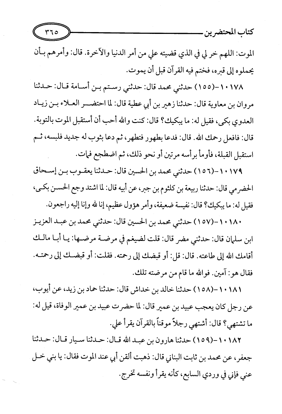 155 - حَدَّثَنِي مُحَمَّدٌ قَالَ: حَدَّثَنِي رُسْتُمُ بْنُ أُسَامَةَ قَالَ: حَدَّثَنَا مَرْوَانُ بْنُ مُعَاوِيَةَ قَالَ: حَدَّثَنَا زُهَيْرُ بْنُ أَبِي عَطِيَّةَ قال: لَمَّا احْتُضِرَ الْعَلاَءُ بْنُ زِيَادٍ الْعَدَوِيُّ بَكَى، فَقِيلَ له: مَا يُبْكِيكَ؟ قَالَ: كُنْتُ وَاللَّهِ أُحِبُّ أَنْ أَسْتَقْبِلَ الْمَوْتَ بِالتَّوْبَةِ, قَالَ: فَافْعَلْ رَحِمَكَ اللَّهُ, قَالَ: فَدَعَا بِطَهُورٍ، فَتَطَهَّرَ، ثُمَّ دَعَا بِثَوْبٍ لَهُ جَدِيدٍ، فَلَبِسَهُ، ثُمَّ اسْتَقْبَلَ الْقِبْلَةَ، فَأَوْمَأَ بِرَأْسِهِ مَرَّتَيْنِ أَوْ نَحْوَ ذَلِكَ، ثُمَّ اضْطَجَعَ فَمَاتَ.