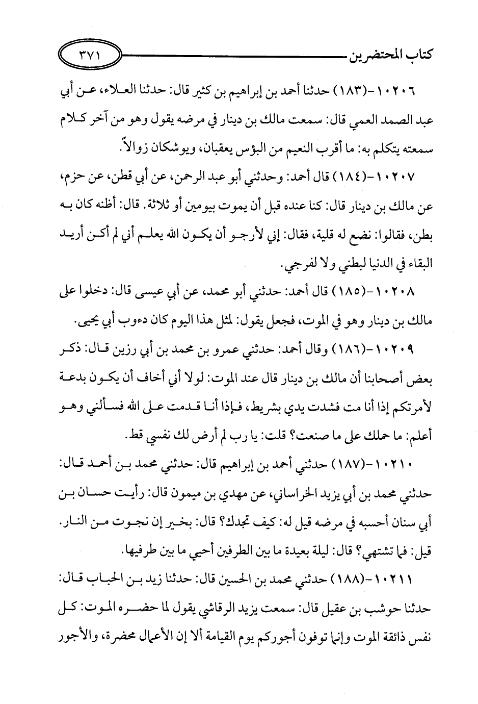 184 - قَالَ أَحْمَدُ: وَحَدَّثَنِي أَبُو عَبْدِ الرَّحْمَنِ، عَنْ أَبِي قَطَنٍ، عَنْ حَزْمٍ، عَنْ مَالِكِ بْنِ دِينَارٍ قَالَ: كُنَّا عِنْدَهُ قَبْلَ أَنْ يَمُوتَ بِيَوْمَيْنِ أَوْ ثَلاَثَةٍ، قَالَ: أَظُنُّهُ كَانَ بِهِ بَطْنٌ، فَقَالُوا: نَضَعُ لَهُ قَلِيَّةً، فَقَالَ: إِنِّي لأَرْجُو أَنْ يَكُونَ اللَّهُ يَعْلَمُ أَنِّي لَمْ أَكُنْ أُرِيدُ الْبَقَاءَ فِي الدُّنْيَا لِبَطْنِي وَلاَ لِفَرْجِي.