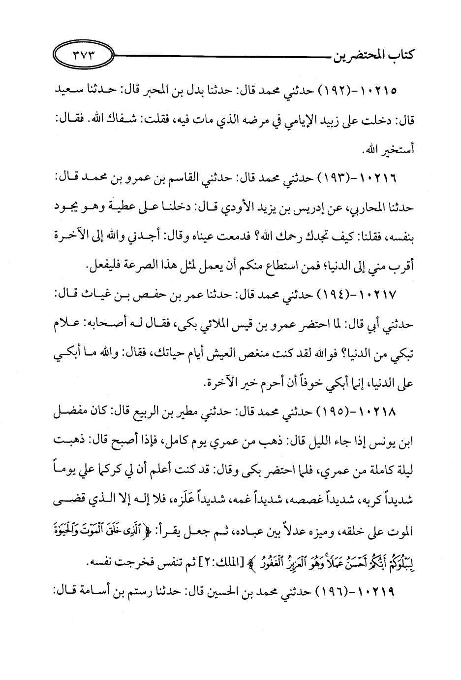 194 - حَدَّثَنِي مُحَمَّدٌ قَالَ: حَدَّثَنَا عُمَرُ بْنُ حَفْصِ بْنِ غِيَاثٍ قَالَ: حَدَّثَنِي أَبِي قَالَ: لَمَّا احْتُضِرَ عَمْرُو بْنُ قَيْسٍ الْمُلاَئِيُّ بَكَى، فَقَالَ لَهُ أَصْحَابُهُ: عَلاَمَ تَبْكِي مِنَ الدُّنْيَا؟ فَوَاللَّهِ لَقَدْ كُنْتَ مُنَغَّصَ الْعَيْشِ أَيَّامَ حَيَاتِكَ فَقَالَ: وَاللَّهِ مَا أَبْكِي عَلَى الدُّنْيَا، إِنَّمَا أَبْكِي خَوْفًا أَنْ أُحْرَمَ خَيْرَ الآخِرَةِ.