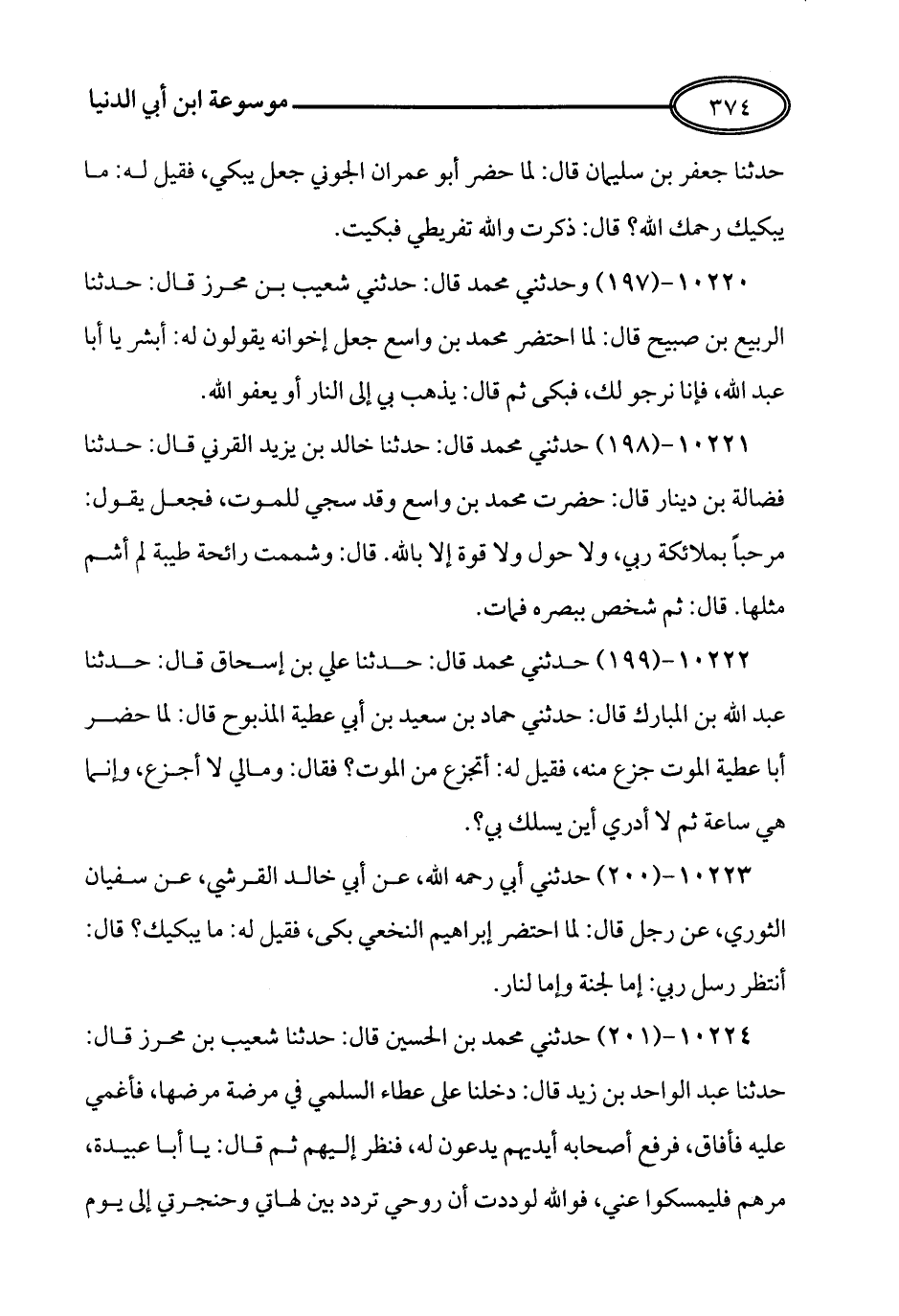 197 - وَحَدَّثَنِي مُحَمَّدٌ قَالَ: حَدَّثَنِي شُعَيْبُ بْنُ مُحْرِزٍ قَالَ: حَدَّثَنَا الرَّبِيعُ بْنُ صُبَيْحٍ قَالَ: لَمَّا احْتُضِرَ مُحَمَّدُ بْنُ وَاسِعٍ جَعَلَ إِخْوَانُهُ يَقُولُونَ لَهُ: أَبْشِرْ يَا أَبَا عَبْدِ اللهِ، فَإِنَّا نَرْجُو لَكَ, فَبَكَى ثُمَّ قَالَ: يُذْهَبُ بِي إِلَى النَّارِ أَوْ يَعْفُو اللَّهُ.