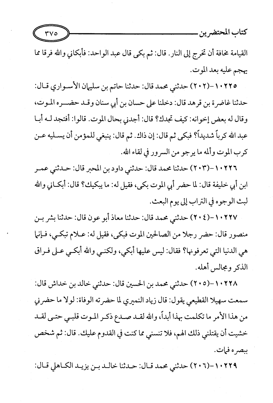 205 - حَدَّثَنِي مُحَمَّدُ بْنُ الْحُسَيْنِ قَالَ: حَدَّثَنِي خَالِدُ بْنُ خِدَاشٍ قَالَ: سَمِعْتُ سُهَيْلاً الْقَطِيعِيَّ يَقُولُ: قَالَ زِيَادٌ النُّمَيْرِيُّ لَمَّا حَضَرَتْهُ الْوَفَاةُ: لَوْلاَ مَا حَضَرَنِي مِنْ هَذَا الأَمْرِ مَا تَكَلَّمْتُ بِهَذَا أَبَدًا؛ وَاللَّهِ لَقَدْ صَدَعَ ذِكْرُ الْمَوْتِ قَلْبِي حَتَّى لَقَدْ خَشِيتُ أَنْ يَقْتُلَنِي ذَلِكَ الْهَمُّ، فَلاَ تَنْسَنِي مِمَّا كُنْتُ فِي الْقُدُومِ عَلَيْكَ, قَالَ: ثُمَّ شَخَصَ بِبَصَرِهِ فَمَاتَ.