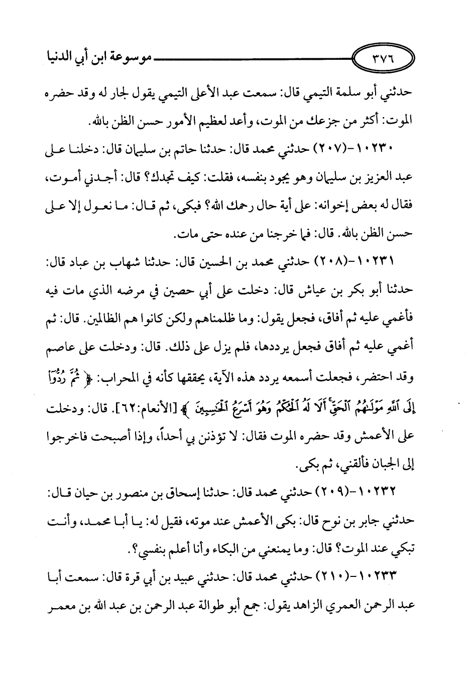 208 - حَدَّثَنِي مُحَمَّدُ بْنُ الْحُسَيْنِ قَالَ: حَدَّثَنَا شِهَابُ بْنُ عَبَّادٍ قَالَ: حَدَّثَنَا أَبُو بَكْرِ بْنُ عَيَّاشٍ قَالَ: دَخَلْتُ عَلى أَبِي حُصَيْنٍ فِي مَرَضِهِ الَّذِي مَاتَ فِيهِ، فَأُغْمِيَ عَلَيْهِ، ثُمَّ أَفَاقَ، فَجَعَلَ يَقُولُ: {وَمَا ظَلَمْنَاهُمْ وَلَكِنْ كَانُوا هُمُ الظَّالِمِينَ} قَالَ: ثُمَّ أُغْمِيَ عَلَيْهِ، ثُمَّ أَفَاقَ، فَجَعَلَ يُرَدِّدُهَا، فَلَمْ يَزَلْ عَلَى ذَلِكَ, قَالَ: وَدَخَلْتُ عَلَى عَاصِمٍ وَقَدِ احْتُضِرَ، فَجَعَلْتُ أَسْمَعُهُ يُرَدِّدُ هَذِهِ الآيَةَ، يُحَقِّقُهَا كَأَنَّهُ فِي الْمِحْرَابِ: {ثُمَّ رُدُّوا إِلَى اللهِ مَوْلاَهُمُ الْحَقُّ أَلاَ لَهُ الْحُكْمُ وَهُوَ أَسْرَعُ الْحَاسِبِينَ} قَالَ: وَدَخَلْتُ عَلَى الأَعْمَشِ وَقَدْ حَضَرَهُ الْمَوْتُ فَقَالَ: لاَ تُؤْذِنَنَّ بِي أَحَدًا، وَإِذَا أَصْبَحْتَ فَاخْرُجُوا إِلَى الْجَبَّانِ فَأَلْقِنِّي، ثُمَّ بَكَى.
