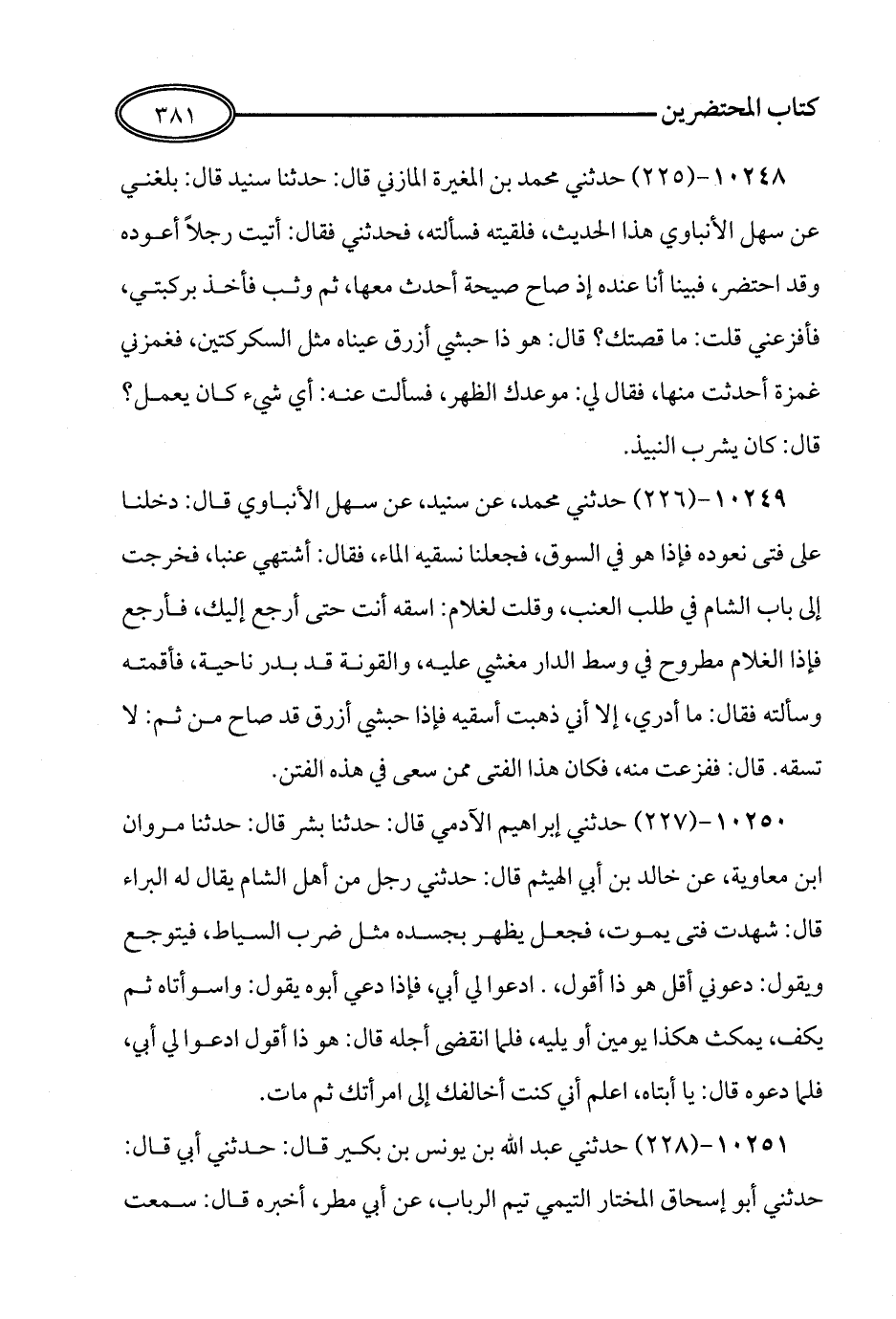 225 - حَدَّثَنِي مُحَمَّدُ بْنُ الْمُغِيرَةِ الْمَازِنِيُّ قَالَ: حَدَّثَنَا سُنَيْدٌ قَالَ: بَلَغَنِي عَنْ سَهْلٍ الأَنْبَاوِيِّ هَذَا الْحَدِيثُ، فَلَقِيتُهُ، فَسَأَلْتُهُ، فَحَدَّثَنِي فَقَالَ: أَتَيْتُ رَجُلاً أَعُودُهُ وَقَدِ احْتُضِرَ، فَبَيْنَا أَنَا عِنْدَهُ، إِذْ صَاحَ صَيْحَةً أَحْدَثَ مَعَهَا، ثُمَّ وَثَبَ فَأَخَذَ بِرُكْبَتِي، فَأَفْزَعَنِي قُلْتُ: مَا قِصَّتُكَ؟ قَالَ: هُوَ ذَا حَبَشِيٌّ أَزْرَقُ، عَيْنَاهُ مِثْلُ السُّكْرُكَتَيْنِ، فَغَمَزَنِي غَمْزَةً أَحْدَثْتُ مِنْهَا، فَقَالَ لِي: مَوْعِدُكَ الظُّهْرَ, فَسَأَلْتُ عَنْهُ: أَيَّ شَيْءٍ كَانَ يَعْمَلُ؟ قَالَ: كَانَ يَشْرَبُ النَّبِيذَ.