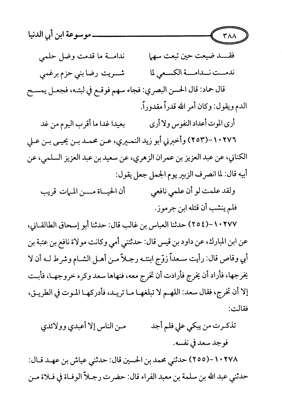 253 - وَأَخْبَرَنِي أَبُو زَيْدٍ النُّمَيْرِيُّ، عَنْ مُحَمَّدِ بْنِ يَحْيَى بْنِ عَلِيٍّ الْكِنَانِيِّ، عَنْ عَبْدِ الْعَزِيزِ بْنِ عِمْرَانَ الزُّهْرِيِّ، عَنْ سَعِيدِ بْنِ عَبْدِ الْعَزِيزِ السُّلَمِيِّ، عَنْ أَبِيهِ قَالَ: لَمَّا انْصَرَفَ الزُّبَيْرُ يَوْمَ الْجَمَلِ جَعَلَ يَقُولُ: