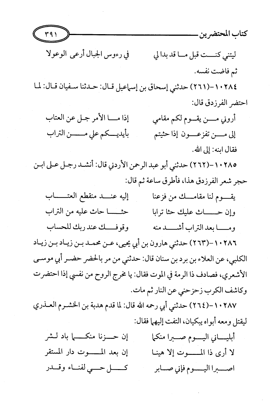 261 - حَدَّثَنِي إِسْحَاقُ بْنُ إِسْمَاعِيلَ قَالَ: حَدَّثَنَا سُفْيَانُ قَالَ: لَمَّا احْتُضِرَ الْفَرَزْدَقُ قَالَ:
