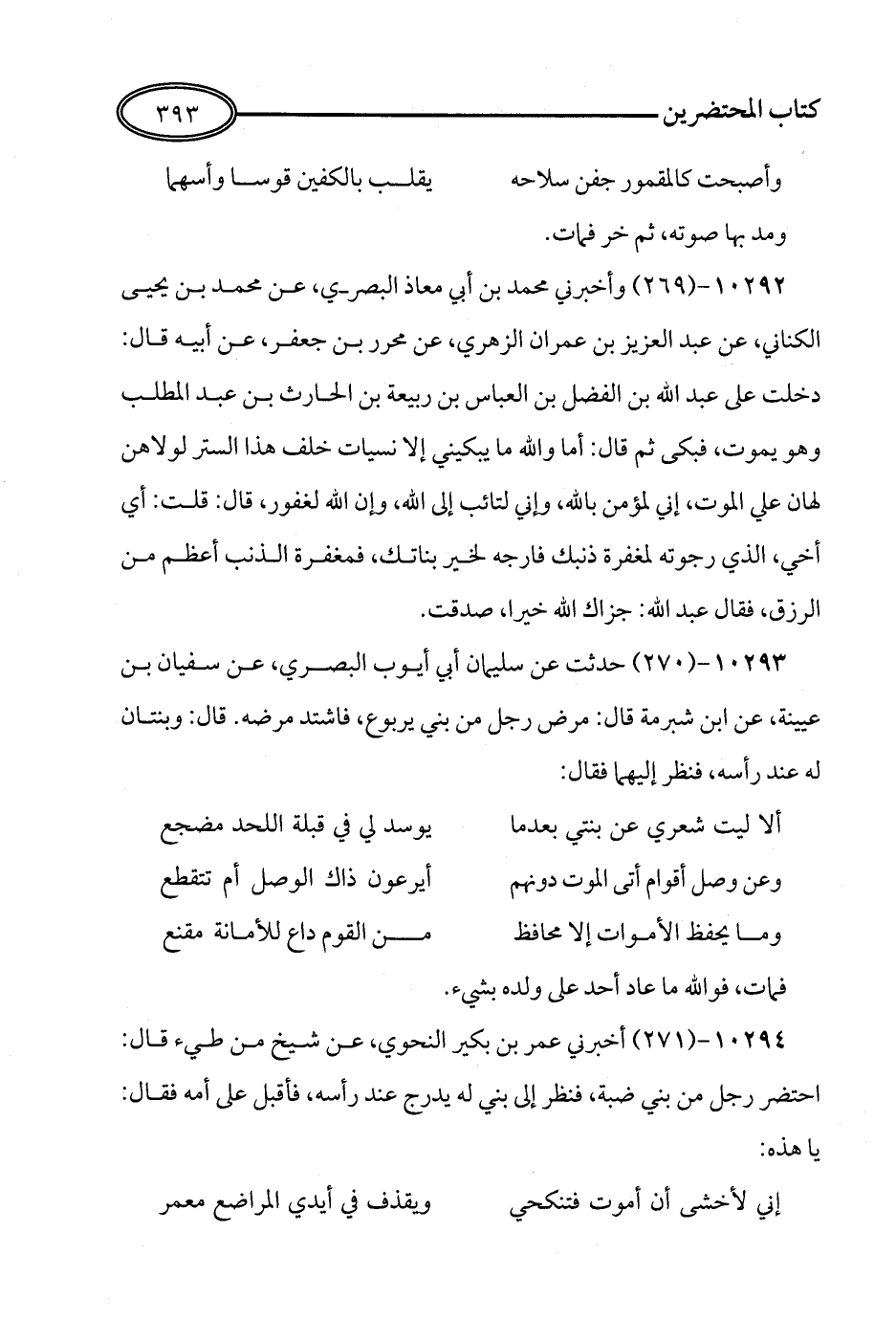 269 - وَأَخْبَرَنِي مُحَمَّدُ بْنُ أَبِي مُعَاذٍ الْبَصْرِيُّ، عَنْ مُحَمَّدِ بْنِ يَحْيَى الْكِنَانِيِّ، عَنْ عَبْدِ الْعَزِيزِ بْنِ عِمْرَانَ الزُّهْرِيِّ، عَنْ مُحَرَّرِ بْنِ جَعْفَرٍ، عَنْ أَبِيهِ قَالَ: دَخَلْتُ عَلَى عَبْدِ اللهِ بْنِ الْفَضْلِ بْنِ الْعَبَّاسِ بْنِ رَبِيعَةَ بْنِ الْحَارِثِ بْنِ عَبْدِ الْمُطَّلِبِ وَهُوَ يَمُوتُ، فَبَكَى ثُمَّ قَالَ: أَمَا وَاللَّهِ مَا يُبْكِينِي إِلاَّ نُسَيَّاتٍ خَلْفَ هَذَا السِّتْرِ، لَوْلاَهُنَّ لَهَانَ عَلَيَّ الْمَوْتُ. إِنِّي لَمُؤْمِنٌ بِاللَّهِ، وَإِنِّي لَتَائِبٌ إِلَى اللهِ، وَإِنَّ اللَّهَ لَغَفُورٌ, قَالَ: قُلْتُ: أَيْ أَخِي، الَّذِي رَجَوْتَهُ لِمَغْفِرَةِ ذَنْبِكَ فَارْجُهُ لِخَيْرِ بَنَاتِكَ، فَمَغْفِرَةُ الذَّنْبِ أَعْظَمُ مِنَ الرِّزْقِ, فَقَالَ عَبْدُ اللهِ: جَزَاكَ اللَّهُ خَيْرًا, صَدَقْتَ.