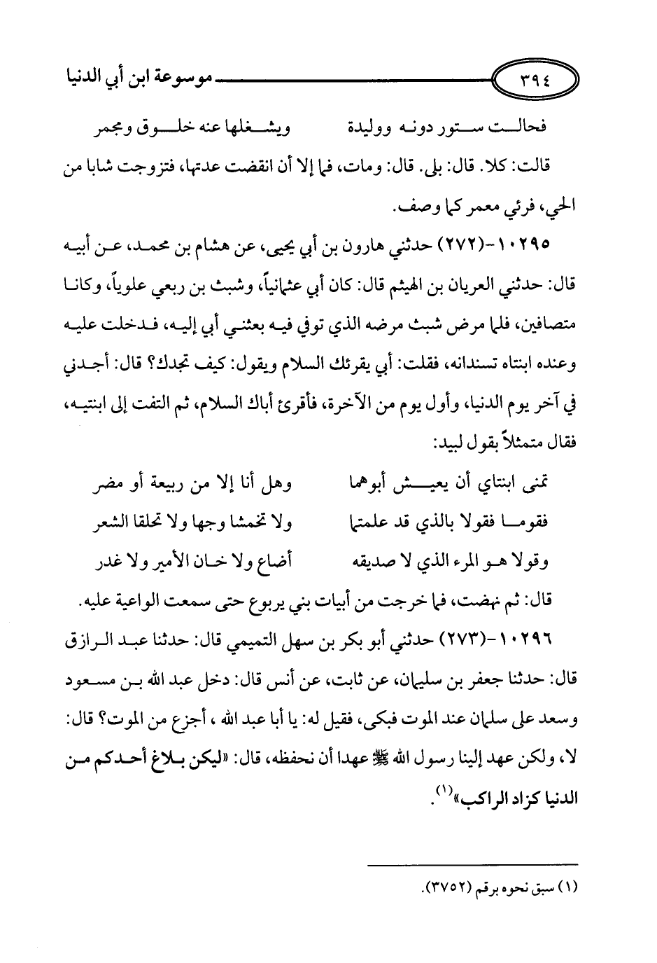 272 - حَدَّثَنِي هَارُونُ بْنُ أَبِي يَحْيَى، عَنْ هِشَامِ بْنِ مُحَمَّدٍ، عَنْ أَبِيهِ قَالَ: حَدَّثَنِي الْعُرْيَانُ بْنُ الْهَيْثَمِ قَالَ: كَانَ أَبِي عُثْمَانِيًّا، وَشَبَثُ بْنُ رِبْعِيٍّ عَلَوِيًّا، وَكَانَا مُتَصَافَّيْنِ, فَلَمَّا مَرِضَ شَبَثٌ مَرَضَهُ الَّذِي تُوُفِّيَ فِيهِ، بَعَثَنِي أَبِي إِلَيْهِ، فَدَخَلْتُ عَلَيْهِ وَعِنْدَهُ ابْنَتَاهُ تَسْنِدَانِهِ، فَقُلْتُ: أَبِي يُقْرِئُكَ السَّلاَمَ وَيَقُولُ: كَيْفَ تَجِدُكَ؟ قَالَ: أَجِدُنِي فِي آخِرِ يَوْمِ الدُّنْيَا، وَأَوَّلِ يَوْمٍ مِنَ الآخِرَةِ، فَأَقْرِئْ أَبَاكَ السَّلاَمَ, ثُمَّ الْتَفَتَ إِلَى ابْنَتَيْهِ، فَقَالَ مُتَمَثِّلاً بِقَوْلِ لَبِيدٍ: