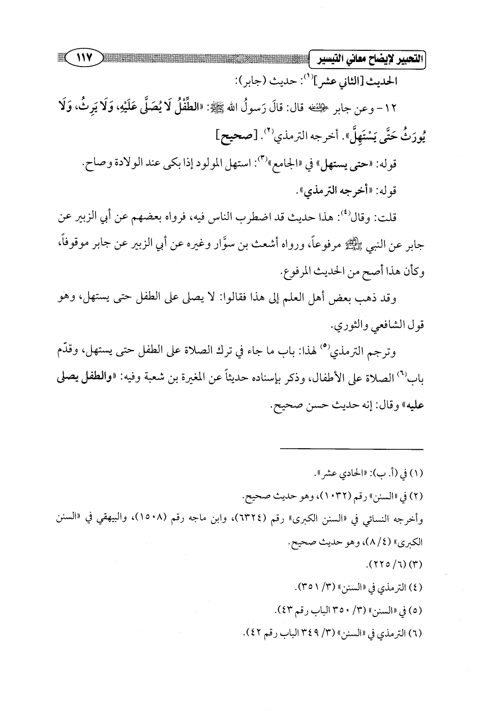 12 - وعن جابر - رضي الله عنه - قال: قَالَ رَسولُ الله - صلى الله عليه وسلم -: "الطِّفْلُ لَا يُصَلَّى عَلَيْه, وَلَا يَرِثُ، وَلَا يُورَثُ حَتَّى يَسْتَهِلَّ". أخرجه الترمذي (¬2). [صحيح]