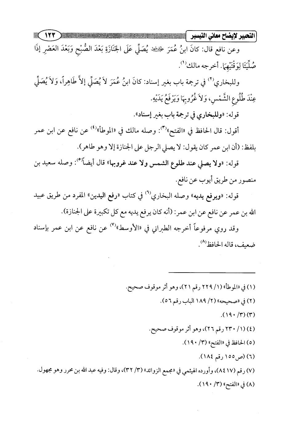 أقول: قال الحافظ في "الفتح" (¬3): وصله مالك في "الموطأ" (¬4) عن نافع عن ابن عمر بلفظ: (أن ابن عمر كان يقول: لا يصلي الرجل على الجنازة إلا وهو طاهر).