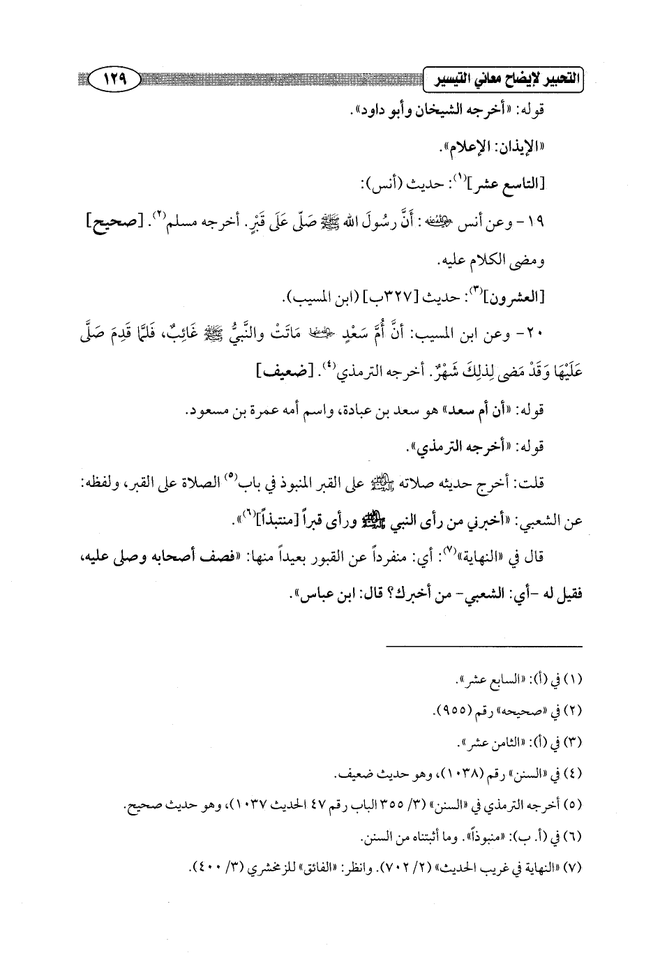 19 - وعن أنس - رضي الله عنه -: أَنَّ رسُولَ الله - صلى الله عليه وسلم - صَلّى عَلَى قَبْرٍ. أخرجه مسلم (¬2). [صحيح] ومضى الكلام عليه.