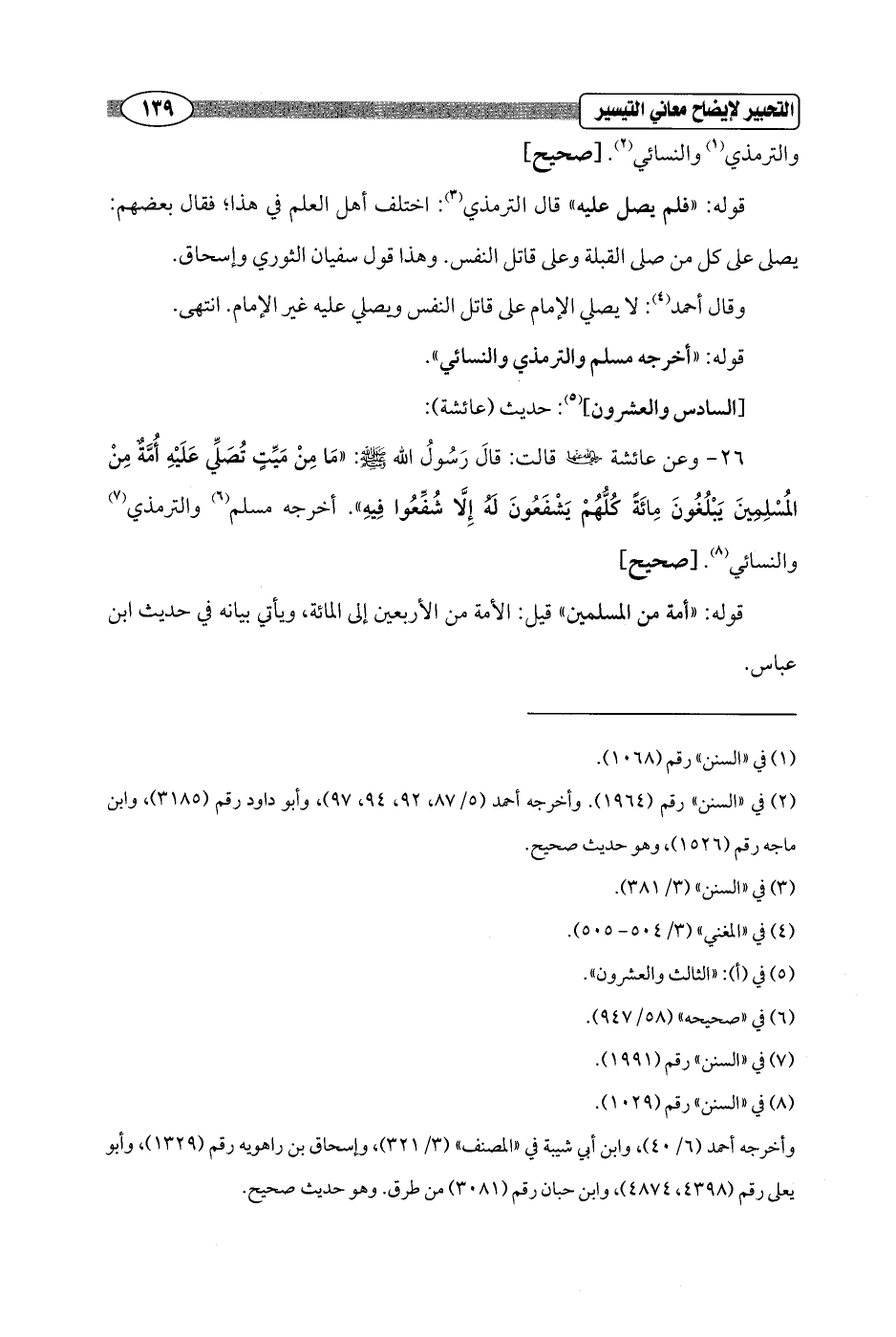 26 - وعن عائشة - رضي الله عنها - قالت: قَالَ رَسُولُ الله - صلى الله عليه وسلم -: "مَا مِنْ مَيِّتٍ تُصَلِّي عَلَيْهِ أُمَّةٌ مِنْ المُسْلِمِينَ يَبْلُغُونَ مِائَةً كلُّهُمْ يَشْفَعُونَ لَهُ إِلَّا شُفِّعُوا فِيهِ". أخرجه مسلم (¬6) والترمذي (¬7) والنسائي (¬8). [صحيح]