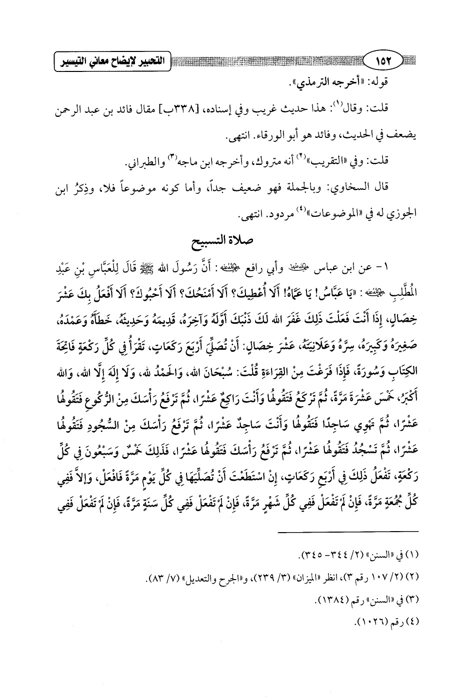 1 - عن ابن عباس - رضي الله عنهما - وأبي رافع - رضي الله عنه -: أَنَّ رَسُولَ الله - صلى الله عليه وسلم - قَالَ لِلْعَبَّاسِ بْنِ عَبْدِ المُطَّلِبِ - رضي الله عنه -: "يَا عَبَّاسُ! يَا عَمَّاهُ! أَلَا أُعْطِيكَ؟ أَلا أَمْنَحُكَ؟ أَلا أَحْبُوكَ؟ أَلا أَفْعَلُ بِكَ عَشْرَ خِصَالٍ، إِذَا أَنْتَ فَعَلْتَ ذَلِكَ غَفَرَ الله لَكَ ذَنْبَكَ أَوَّلَهُ وَآخِرَهُ، قَدِيمَهُ وَحَدِيثَهُ، خَطَأَهُ وَعَمْدَهُ، صَغِيرَهُ وَكَبِيرَهُ، سِرَّهُ وَعَلَانِيَتَهُ، عَشْرَ خِصَالٍ: أَنْ تُصَلِّيَ أَرْبَعَ رَكَعَاتٍ، تَقْرَأُ فِي كُلِّ رَكْعَةٍ فَاتِحَةَ الكِتَابِ وَسُورَةً، فَإِذَا فَرَغْتَ مِنْ القِرَاءَةِ قُلْتَ: سُبْحَانَ الله، وَالحَمْدُ لله، وَلَا إِلَهَ إِلَّا الله، وَالله أَكْبَرُ، خَمْسَ عَشْرَةَ مَرَّةً، ثُمَّ تَرْكَعُ فَتَقُولُها وَأَنْتَ رَاكِعٌ عَشْرًا، ثُمَّ تَرْفَعُ رَأْسَكَ مِنْ الرُّكُوعِ فَتَقُولُها عَشْرًا، ثُمَّ تَهْوِي سَاجِدًا فَتَقُولُها وَأَنْتَ سَاجِدٌ عَشْرًا، ثُمَّ تَرْفَعُ رَأْسَكَ مِنْ السُّجُودِ فَتَقُولُها عَشْرًا، ثُمَّ تَسْجُدُ فَتَقُولُها عَشْرًا، ثُمَّ تَرْفَعُ رَأْسَكَ فَتَقُولُها عَشْرًا، فَذَلِكَ خَمْسٌ وَسَبْعُونَ فِي كُلِّ رَكْعَةٍ، تَفْعَلُ ذَلِكَ فِي أَرْبَعِ رَكَعَاتٍ، إِنْ اسْتَطَعْتَ أَنْ تُصَلِّيَهَا فِي كُلِّ يَوْمٍ مَرَّةً فَافْعَلْ، وَإلاَّ فَفِي كُلِّ جُمُعَةٍ مَرَّةً, فَإِنْ لَمْ تَفْعَلْ فَفِي كُلِّ شَهْرٍ مَرَّةً، فَإِنْ لَمْ تَفْعَلْ فَفِي كُلِّ سَنَةٍ مَرَّةً، فَإِنْ لَمْ تَفْعَلْ فَفِي